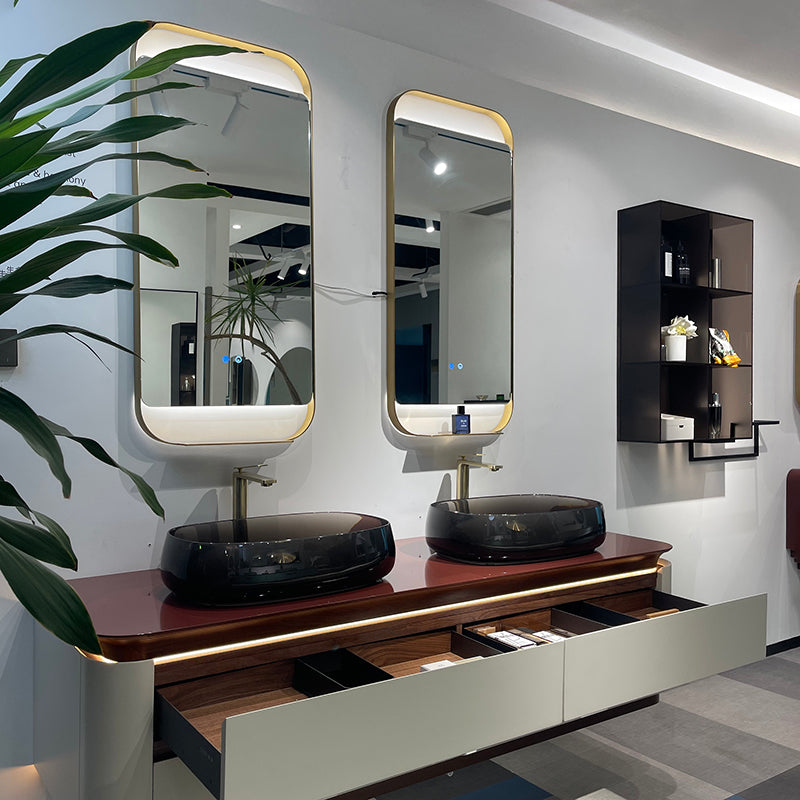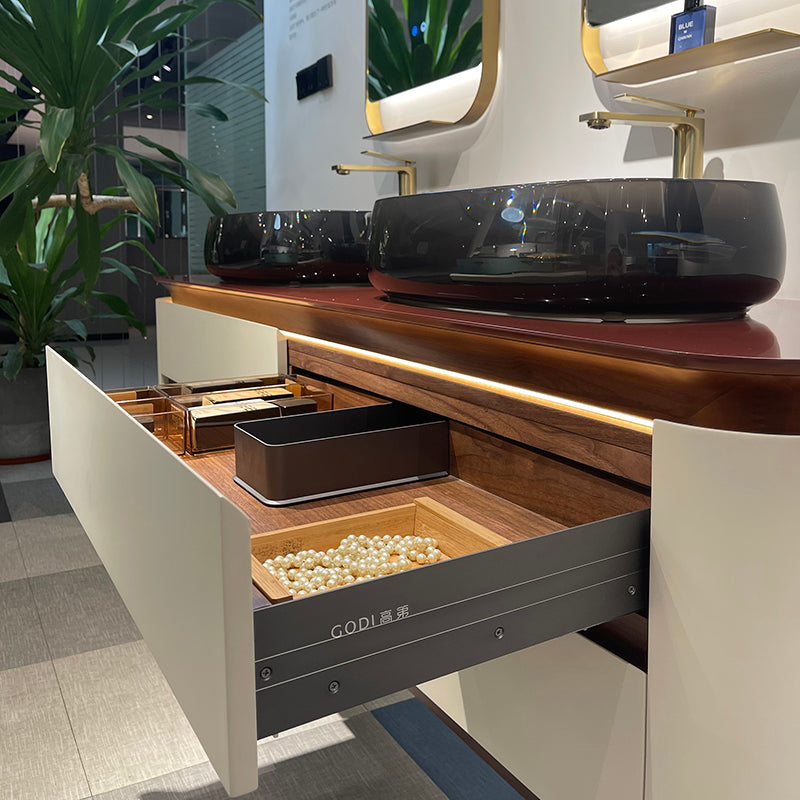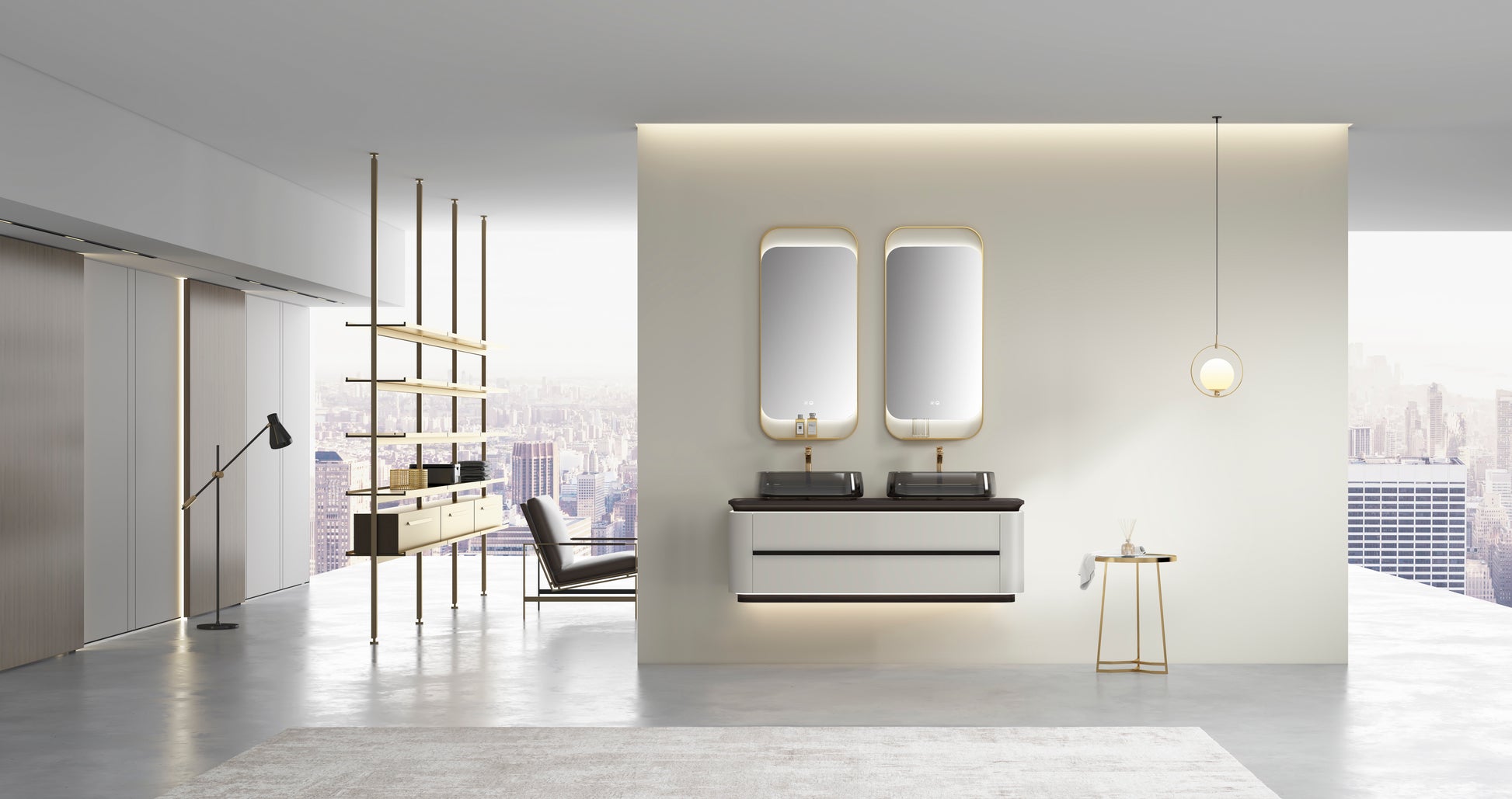 The Lucelle vanity is designed for homeowners and designers who appreciate detail. The curved edges, layered finishes, and bold countertop contrast make it a centerpiece in contemporary master bathrooms. Paired with gold fixtures and illuminated mirrors, it delivers a perfect balance between warmth, luxury, and modern minimalism.