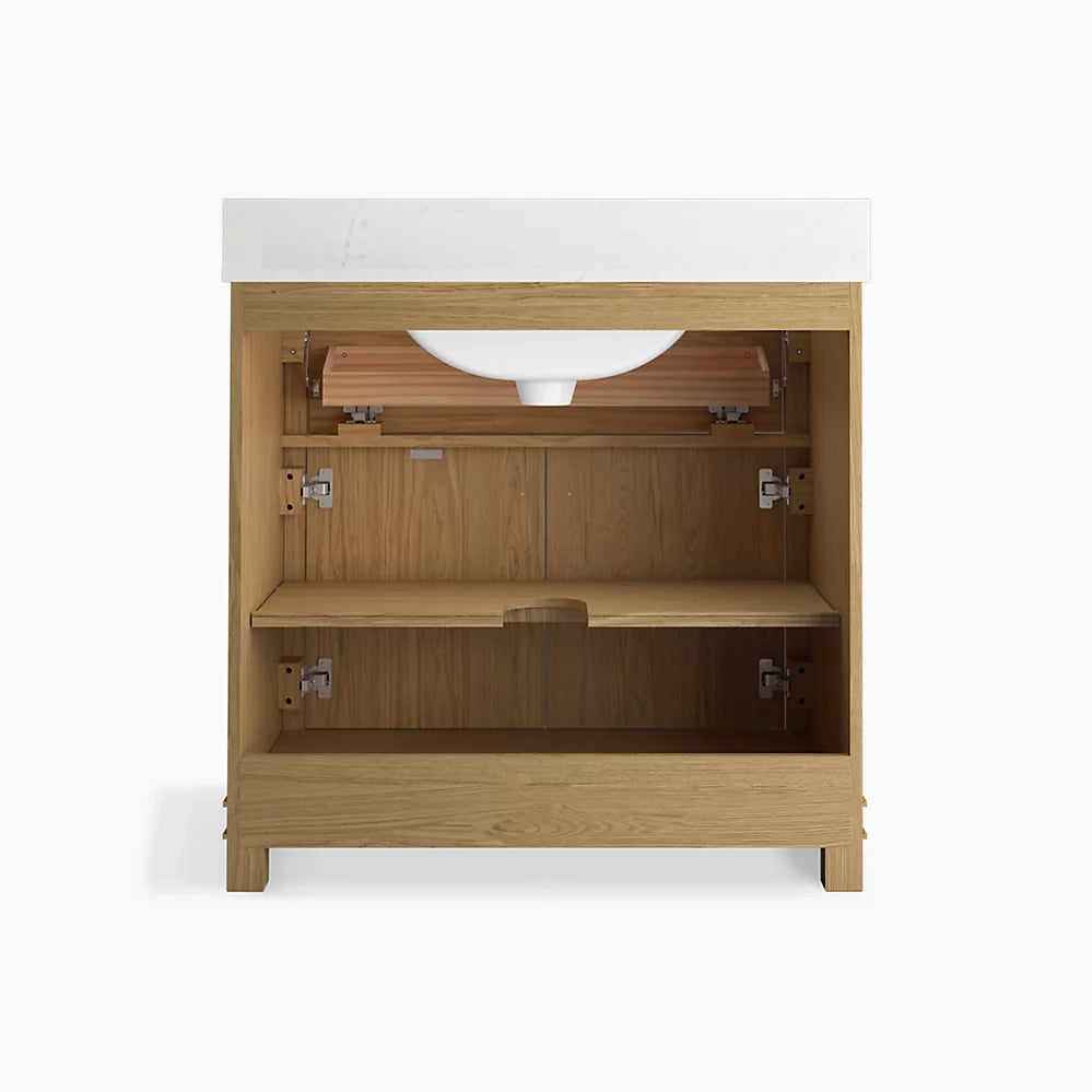 This 36" vanity set includes a two-door cabinet with soft-close hinges, quartz countertop with matching backsplash, sink, and cabinet hardware in Vibrant Brushed Nickel.