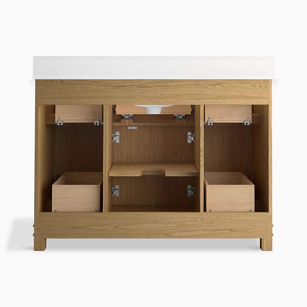 This 48" vanity set includes a cabinet with soft-close hinges, quartz countertop with matching backsplash, a sink, and cabinet hardware in Vibrant Brushed Nickel.