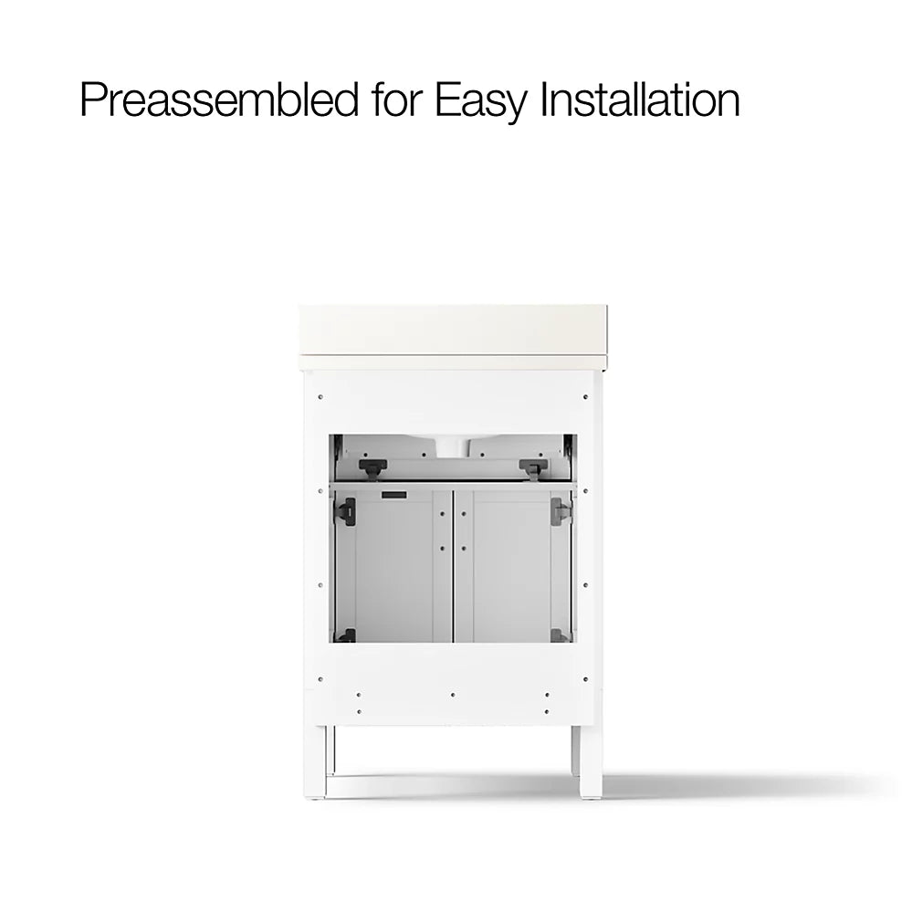 Set includes cabinet, precut quartz vanity top, backsplash, sink, cabinet hardware