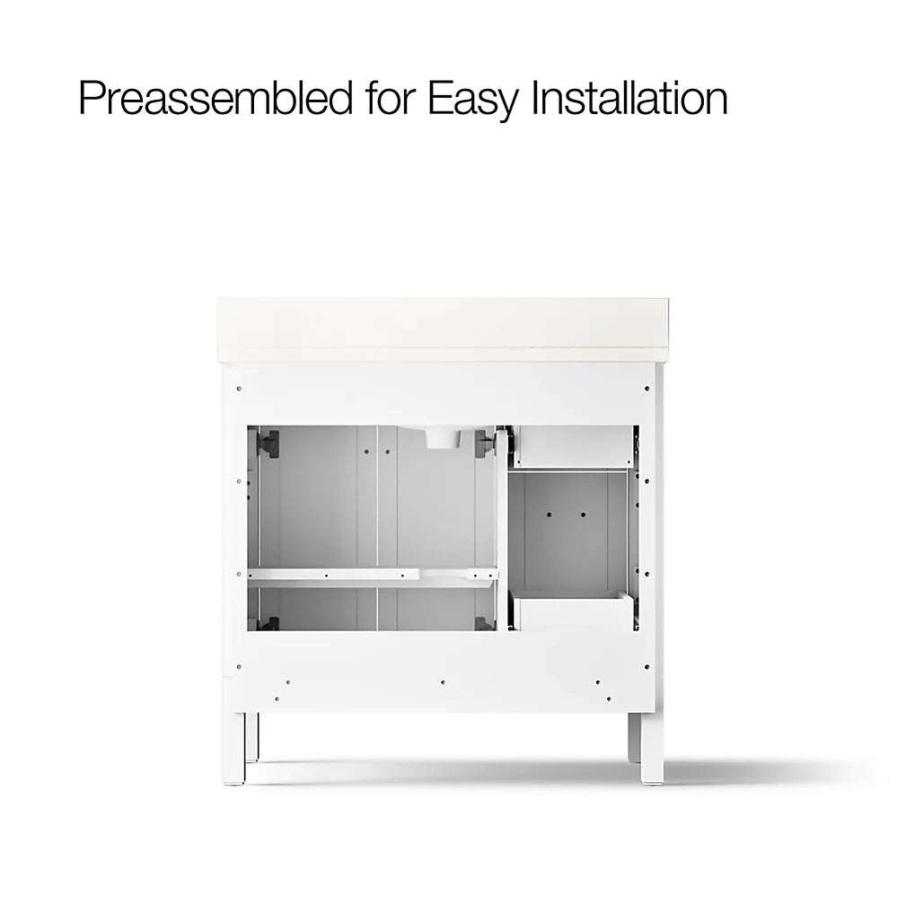Set includes cabinet, precut quartz vanity top, backsplash, sink, cabinet hardware