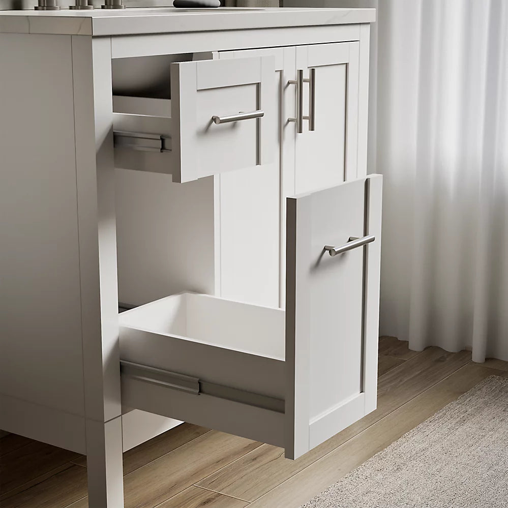 Brushed Nickel hardware included on the White, Atmos Grey, and Light Oak vanities