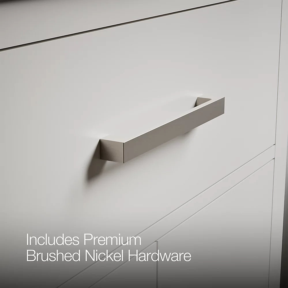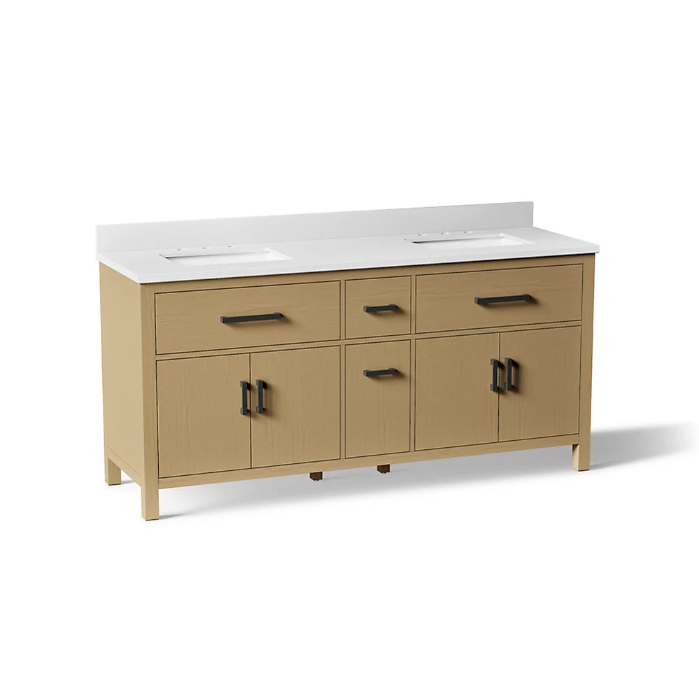 Vanity top has 8" (203 mm) widespread faucet holes; requires deck-mount faucets (sold separately)Brushed Nickel hardware included on White, Atmos Grey, and Carbon Oak vanities, and Matte Black hardware on Light Oak vanities.White (GWT) quartz vanity top and backsplash add beauty and long-lasting durability