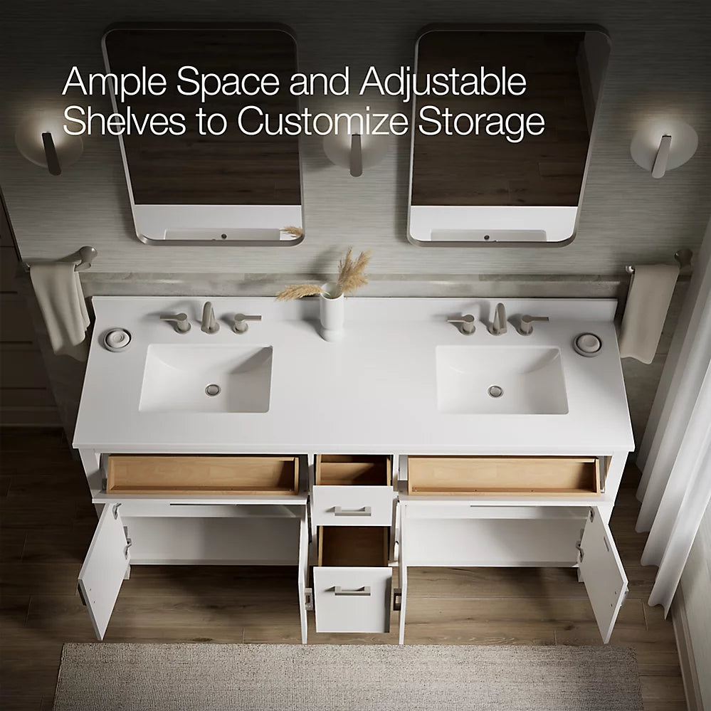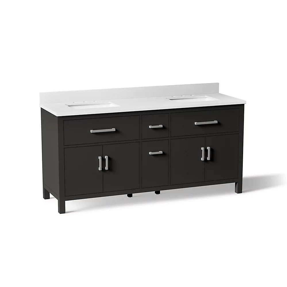 The Kresla 72" vanity set includes cabinet, quartz countertop with matching backsplash, two sinks, and hardware.