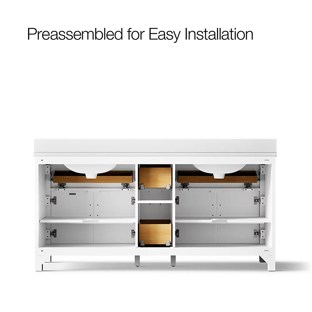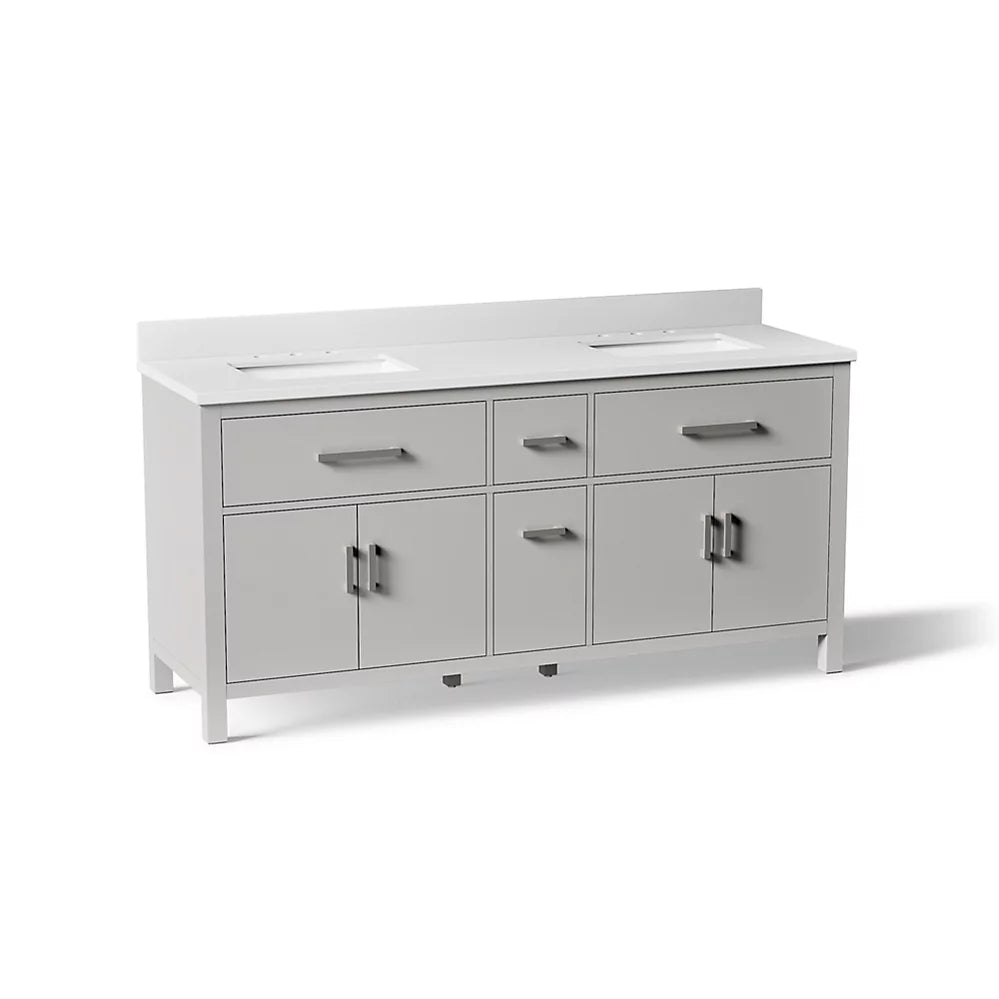 Set includes cabinet, precut quartz vanity top, backsplash, sinks, cabinet hardware