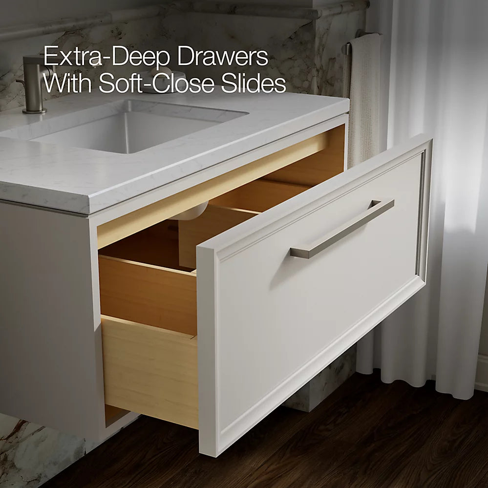 Take your everyday vanity to the next level with personalized cabinet and hardware color selections, plus a coordinating quartz countertop and KOHLER sink pairing (hardware, countertop and sink sold separately).