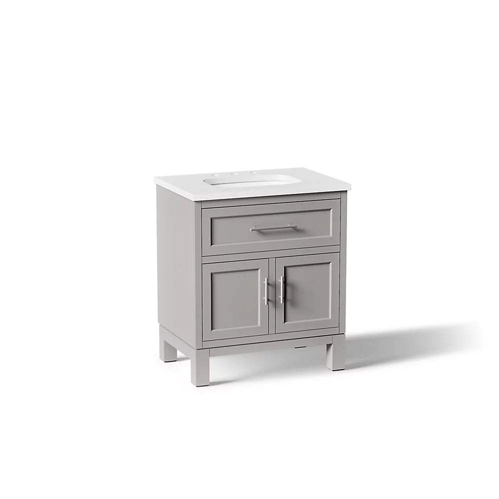Set includes cabinet, precut quartz vanity top, sink, cabinet hardware