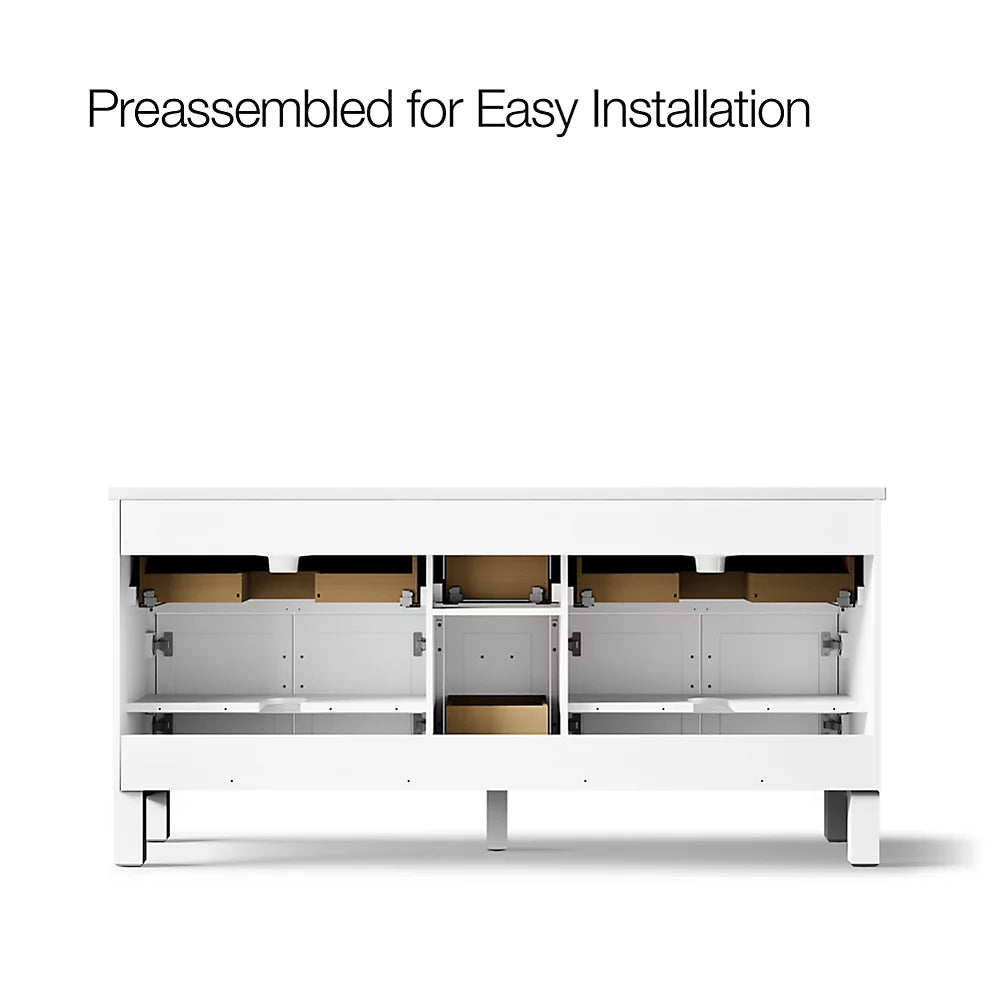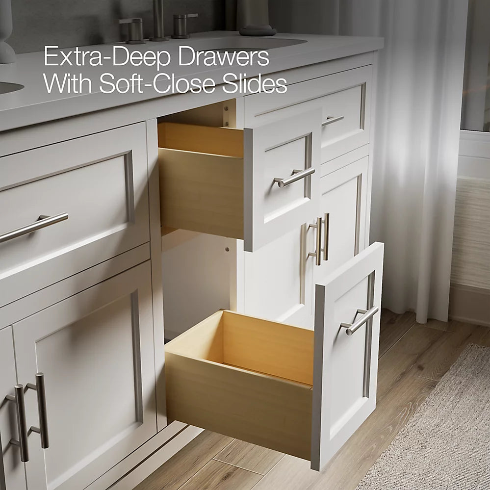 Vanity top has 8" (203 mm) widespread faucet holes; requires deck-mount faucets (sold separately)Three-way adjustable slow-close door hinges for easy cabinet access
