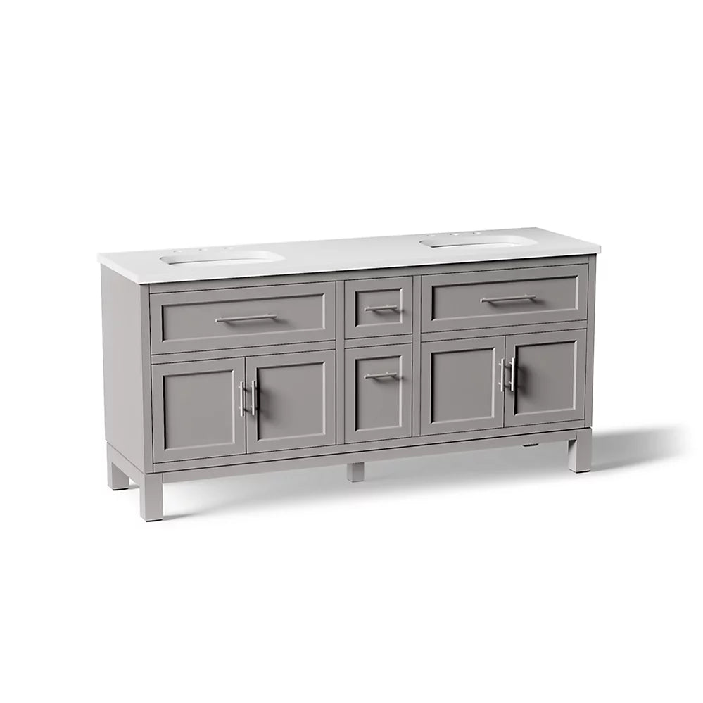 Its transitional design boasts generous storage space, and a coordinating quartz vanity top, two sinks, and cabinet hardware are included.