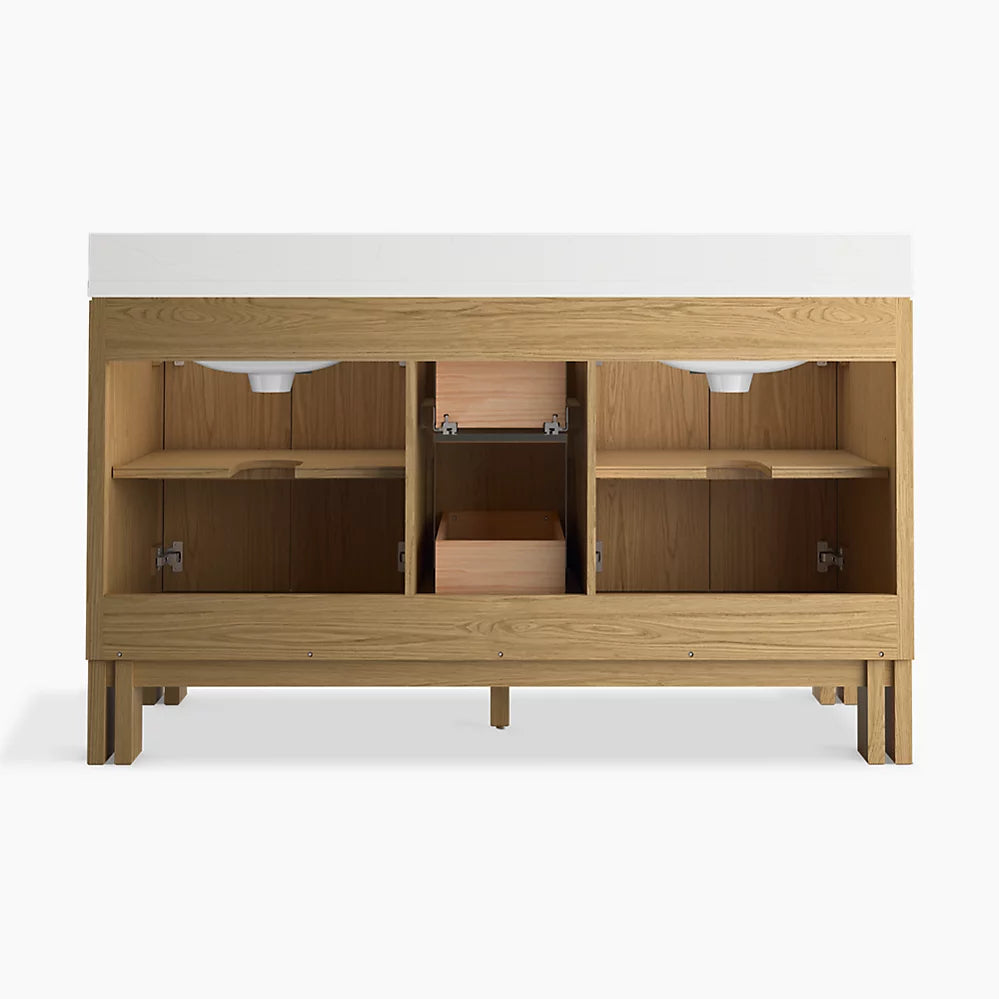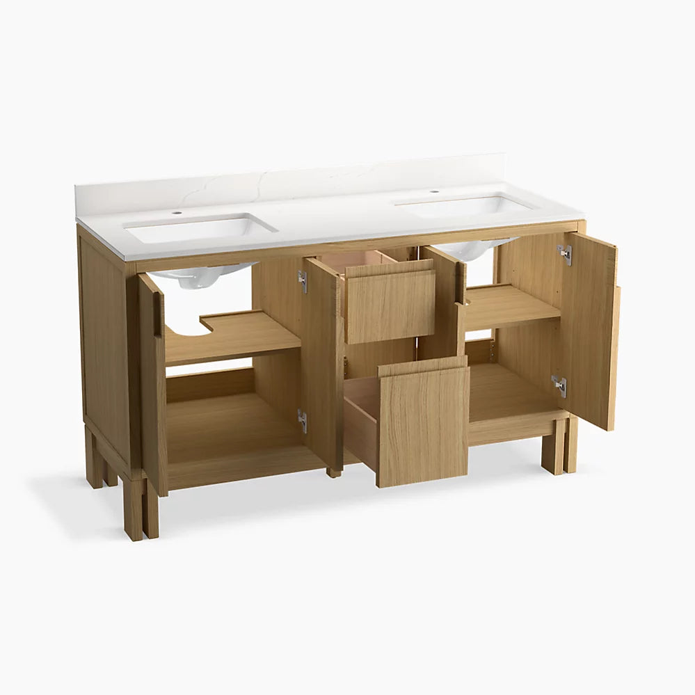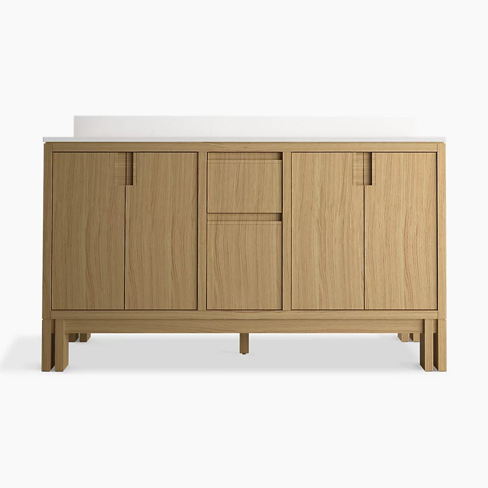This 60" vanity set includes a four-door cabinet with soft-close hinges, quartz countertop with matching backsplash, two sinks, and uniquely integrated cabinet pulls, created by a traditional Japanese joinery technique.
