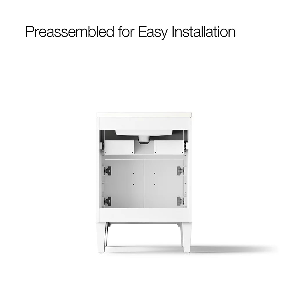 Set includes cabinet, precut quartz vanity top, sink, legs, and cabinet hardware
