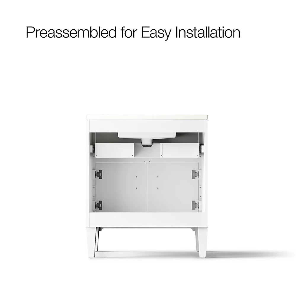 Set includes cabinet, precut quartz vanity top, sink, legs, and cabinet hardware