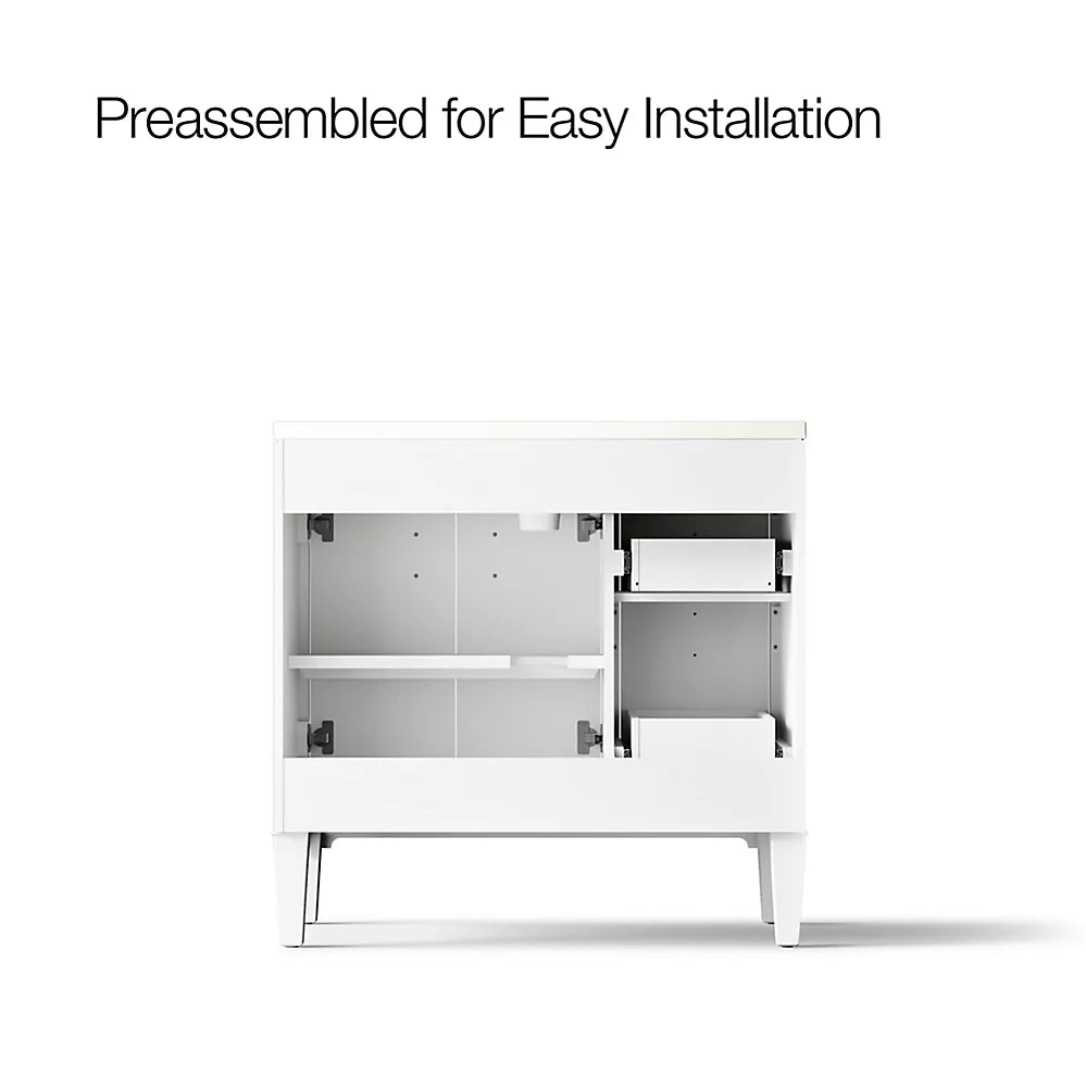 Set includes cabinet, precut quartz vanity top, sink, legs, and cabinet hardware