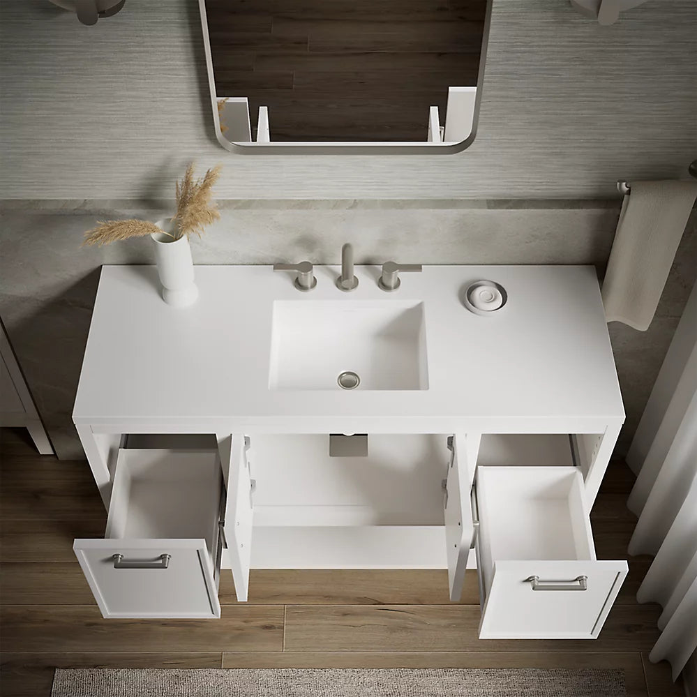 Customize your storage with optional accessories such as floor liners, drawer organizers, and perfectly sized containers (sold separately)Brushed Nickel hardware included on the White and Slate Grey vanities