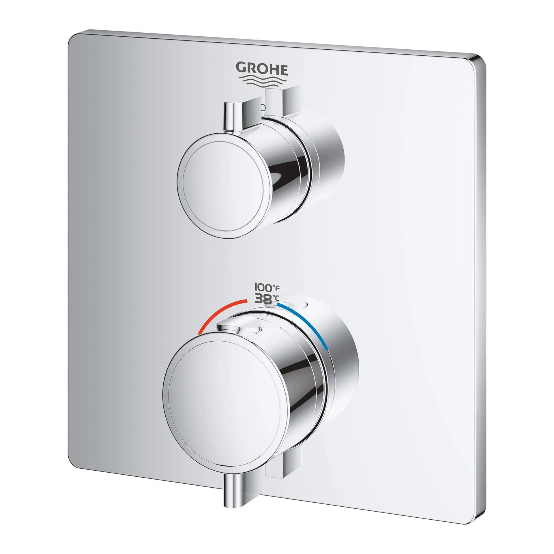 From its slim profile to its intuitive design, the GROHE Grohtherm Single Function 2-Handle Thermostatic Trim with Control Module streamlines the bathroom in both style and experience. Clean and contemporary, it features an upper handle to control volume and on/off, and a lower handle to control temperature. Thoughtfully designed for comfort and enjoyment, Grohtherm features GROHE Turbostat to maintain consistent temperature and GROHE SafeStop to prevent scalding.