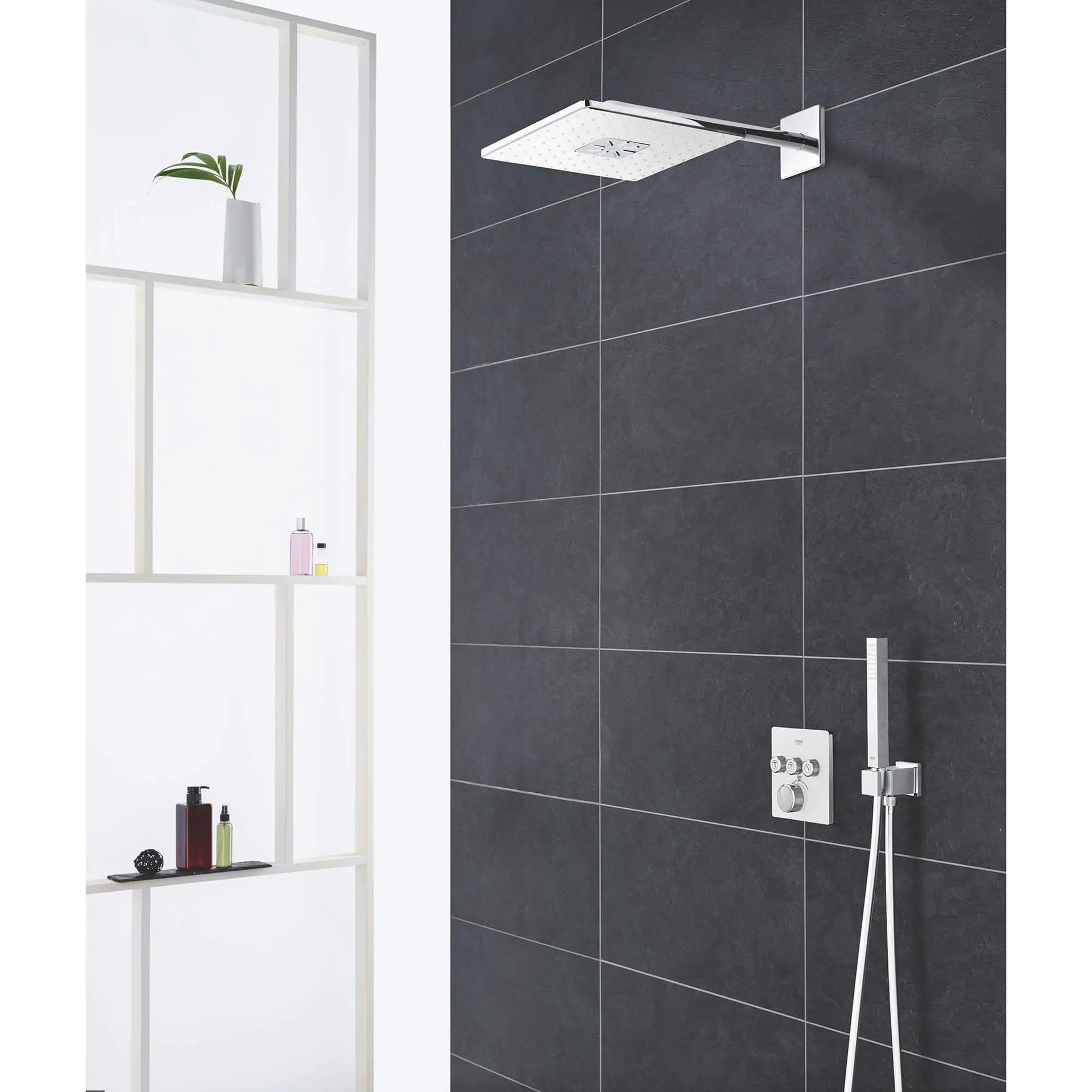 Choose a thermostat that is as flexible as possible for your most enjoyable shower or bath ever. Packed with useful features, the Grohtherm SmartControl concealed thermostat features a minimalist design and stylish Moon White that will enhance any modern bathroom. The innovative SmartControl technology allows you to select your desired spray source and adjust the water volume at the push-turn of a button. The three valves offer total flexibility, whatever your shower set up ��� you can control, switch between or even combine different spray patterns and water outlets ��� perfect for spaces where you want to have hand, head and side showers, as well as a bath. Integrated GROHE Turbostat technology prevents any unpleasant temperature fluctuations. GROHE EasyLogic markings and textured buttons with exchangeable symbols make it easy and intuitive to use. Family-friendly, the GROHE SafeStop override button allows you to set a maximum temperature of 100�� F/38�� C to prevent scalding. Water-saving GROHE EcoJoy technology gives you the option of a reduced flow rate with no compromise on enjoyment. Thanks to the GROHE QuickFix system it���s Swift and straightforward to install. The slim profile makes it easy to keep clean, and the chic, durable GROHE StarLight Moon finish will look pristine for years to come. With a slim, round design perfect for that minimalist, streamlined look, this product is bound to enhance your bathroom scheme. Please note that this product must be installed in combination with the GROHE Rapido SmartBox (35601000).