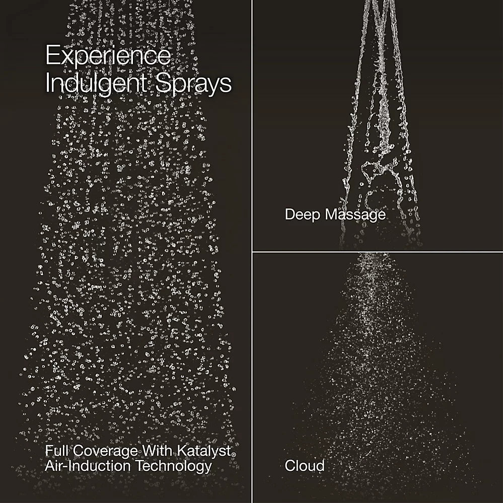 Multifunction handshower with advanced spray engine provides three spray experiences: Full Coverage with Katalyst technology, Deep Massage, and CloudFull Coverage with Katalyst™ air-induction technology delivers a drenching spray experience, ideal for rinsing shampoo from hairDeep Massage streams twist and swirl, targeting sore muscles to ease away aches and painsCloud spray experience restores with a thick cloud of silky, super-fine water dropletsMasterClean™ sprayface features an easy-to-clean surface that withstands mineral buildup and maximizes spray performanceOptimized sprayface for maximum performance1.75 gpm (6.6 lpm) maximum flow rate at 80 psi (5.5 bar)Requires shower hose (sold separately)This product can help a building earn Water Efficiency points in LEED® Green Building Rating System