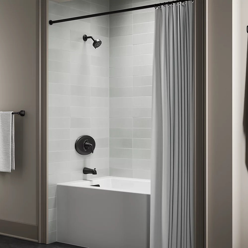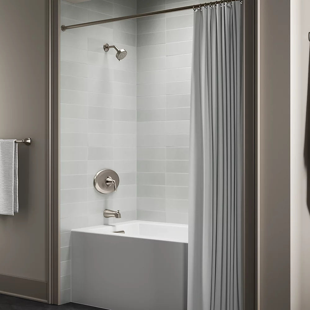 12" (305 mm) escutcheon plate covers two-handle valve assembly holes.Single lever handle allows for both on/off activation and temperature settingAdvanced spray engine provides three alternate experiences: wide coverage, intense drenching, and targeted sprayWide coverage spray produces an encompassing spray for everyday useIntense drenching spray delivers a forceful spray ideal for rinsing shampoo from hairTargeted spray is a focused stream for targeting sore muscles or use as a utility spraySimple thumb tab smoothly transitions between spraysMasterClean™ sprayface features an easy-to-clean surface that withstands mineral buildup and maximizes spray performance1.75 gpm (6.6 lpm) maximum flow rate at 80 psi (5.5 bar)5" (127 mm) spout with slip-fit connection and diverter knobKit includes escutcheon, lever handle, showerhead, shower arm with flange, bath spout, mounting hardware, template.Requires Rite-Temp® pressure-balancing valve (sold separately)