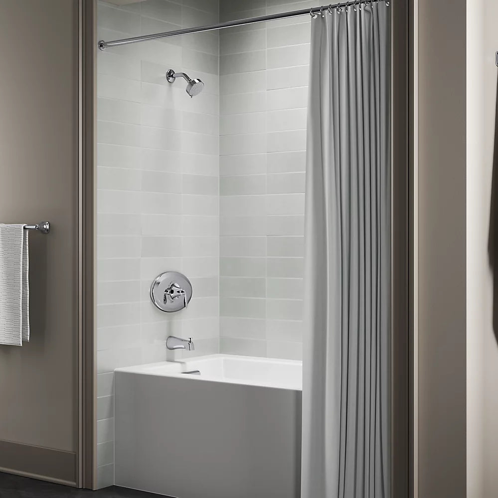 Easily cover the holes from your two-handle bath and shower valving conversion with our Remodel Rite-Temp bath and shower trim kit. The escutcheon plate easily covers holes from your outdated two-handle valve trim installation, and the single-lever handle easily rotates for on/off activation and temperature control. A bath spout and three-function showerhead complete the trio. With clean, attractive lines, the plate, handle, showerhead, and bath spout will fit in with any bathroom decor. At Kohler, we make it our business to help you create the bathroom space of your dreams.