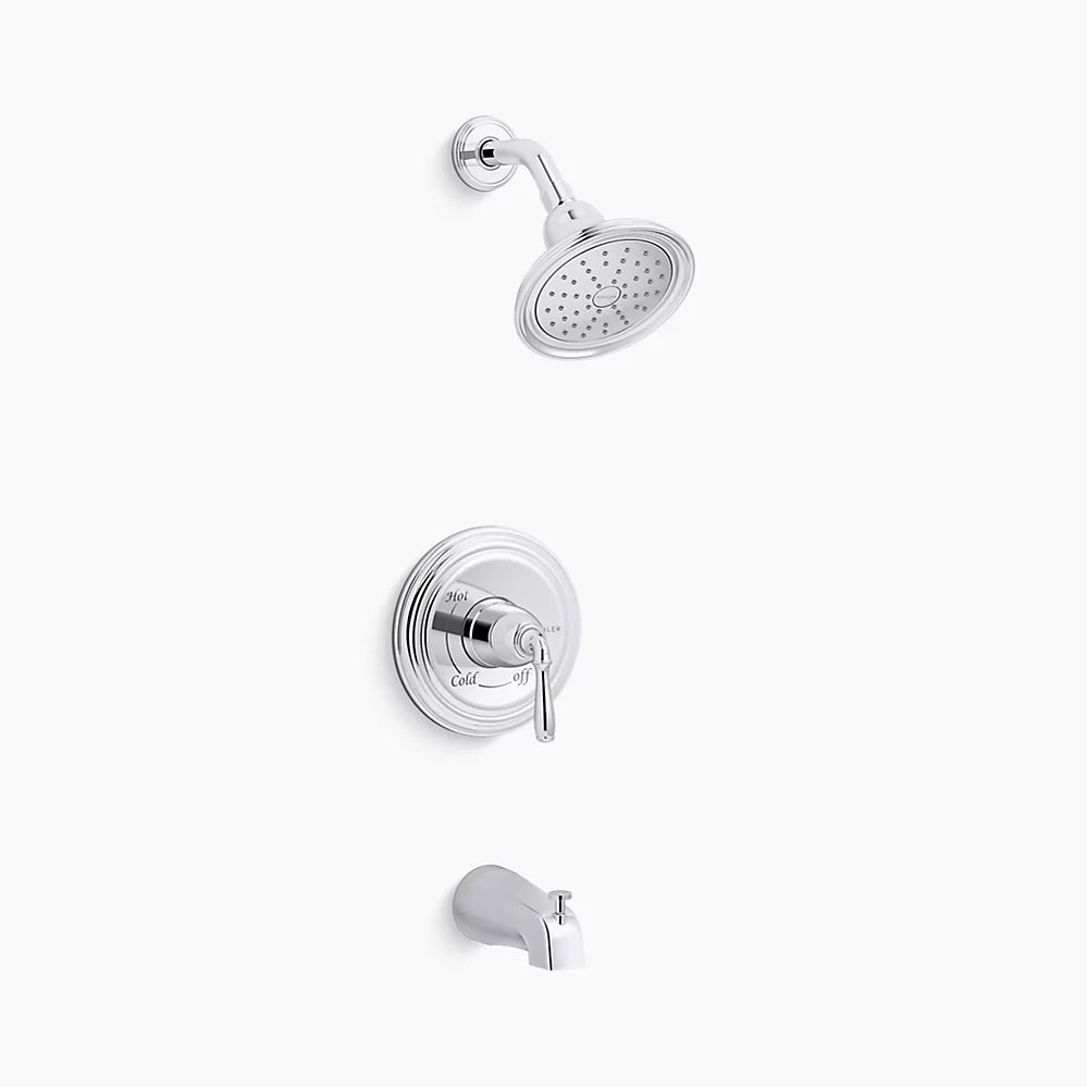 Pressure-balancing diaphragm technology maintains outlet temperature within +/-3°F during water pressure fluctuationsAntiscald protectionA single handle controls both on/off activation and temperature settingIncludes faceplate with ADA-compliant metal lever handleIncludes diverter bath spout with 1/2" NPT connectionSingle-function 1.75 gpm (6.6 lpm) showerhead with Katalyst® air-induction technologyMasterClean™ sprayface features an easy-to-clean surface that withstands mineral buildup and maximizes spray performanceIncludes shower arm and flangeCoordinates with Devonshire faucets, accessories, and showering components to complete your bathroom
