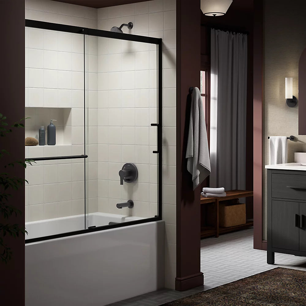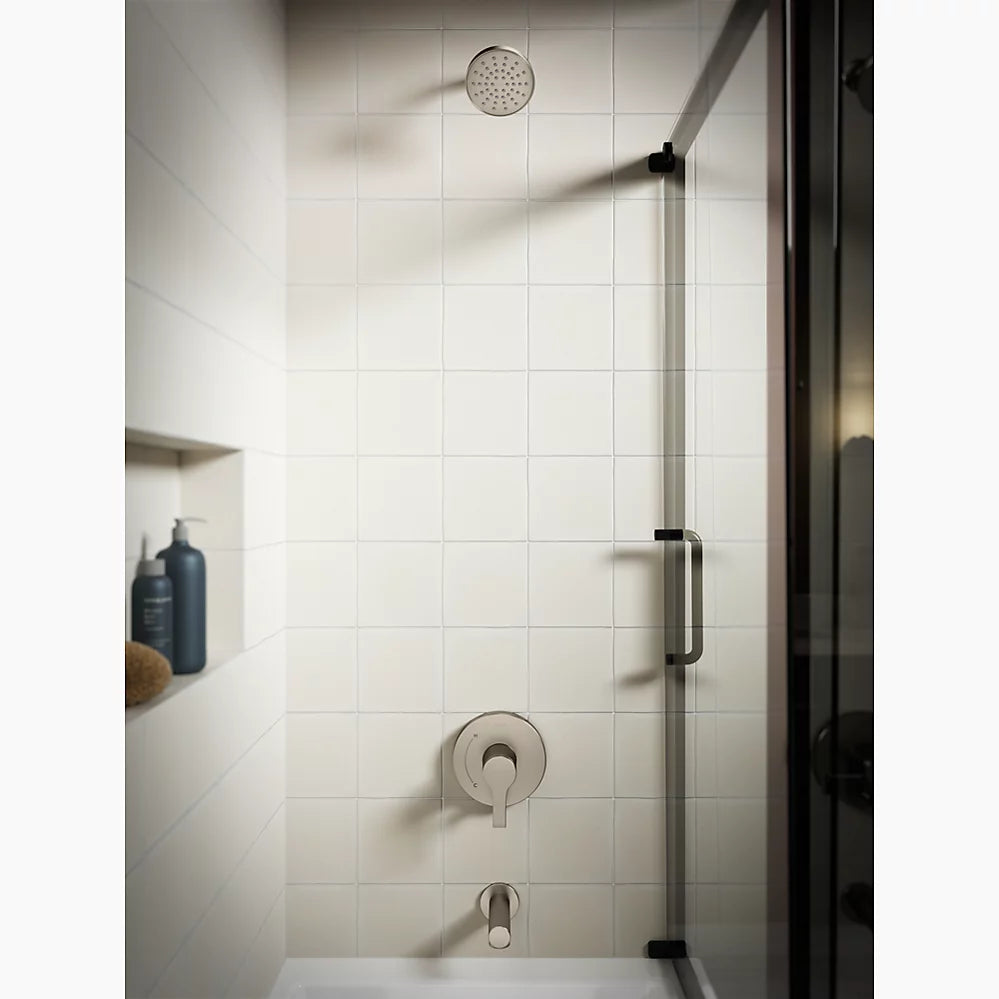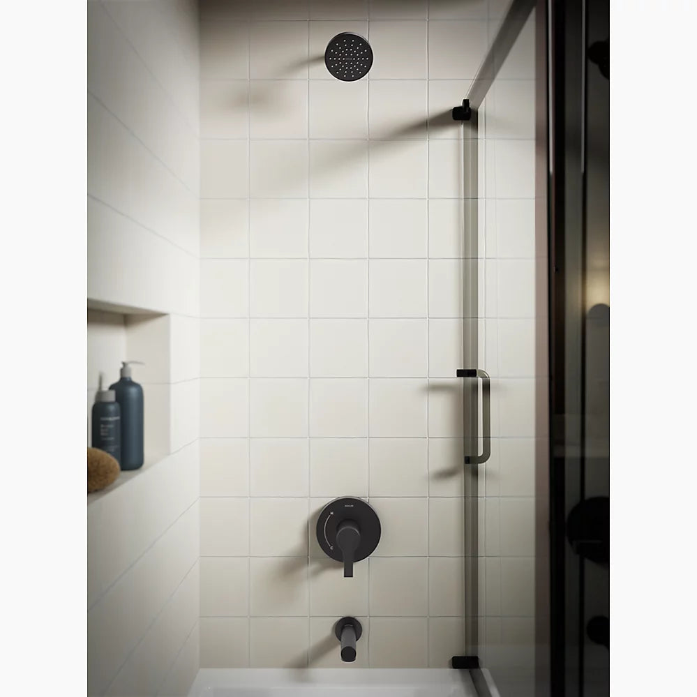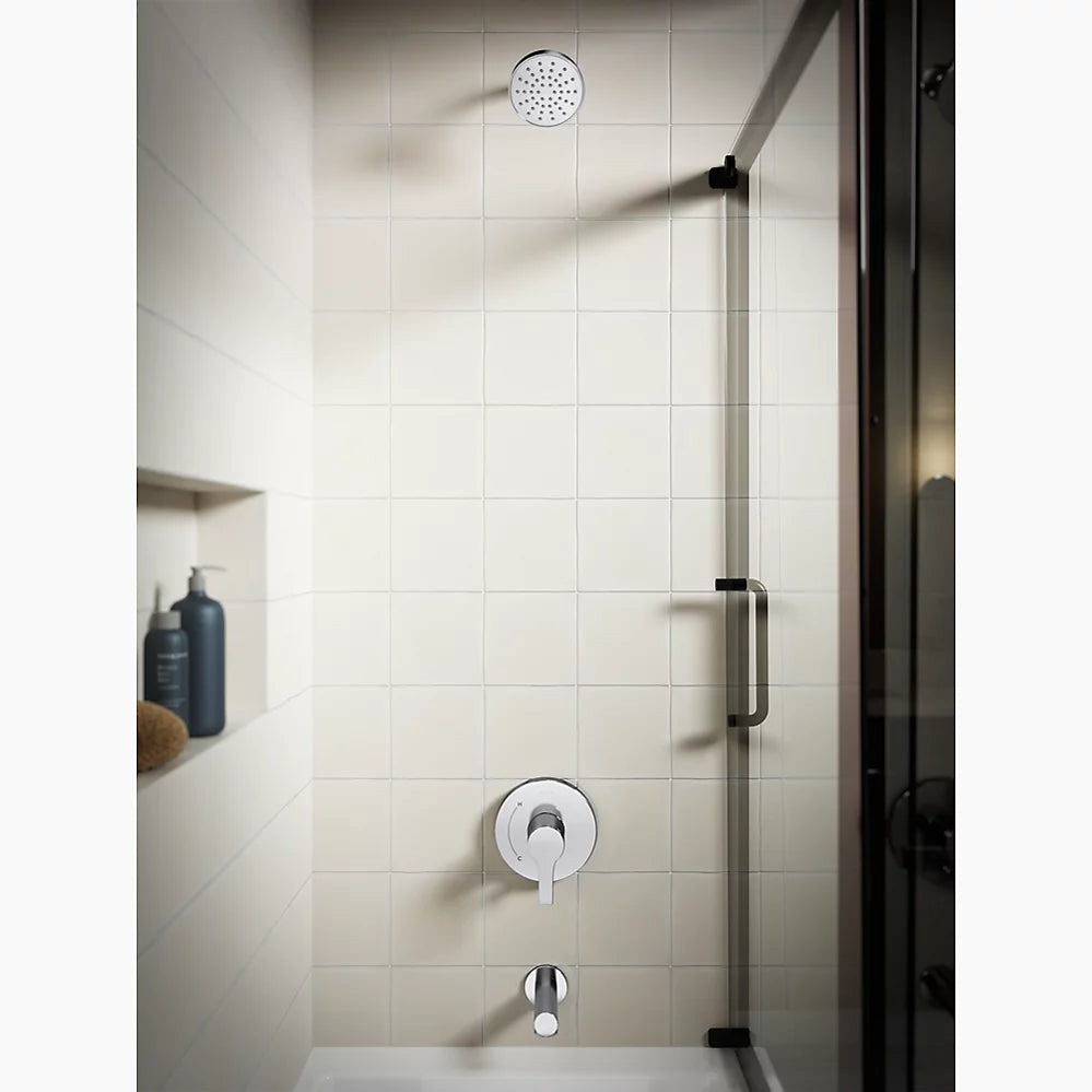 Inspired by pure geometric style, the form of the Elate bathroom faucet collection has a sophisticated fluidity that brings a visually stunning yet simple look to the bathroom. This Elate bath and shower trim kit includes a showerhead, shower arm with flange, a lever handle, push-button diverter, and a bath spout. Pair this trim with a Rite-Temp pressure-balancing valve, which maintains your desired water temperature during pressure fluctuations. At Kohler, we make it our business to help you create the bathroom space of your dreams.