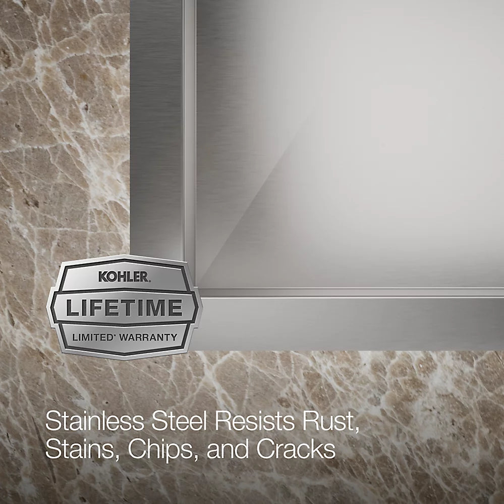 This ergonomic, ADA-compliant KOHLER® Vault sink is handcrafted from durable stainless steel with bold, modern lines that bring contemporary style to your kitchen.
