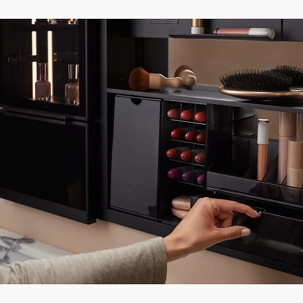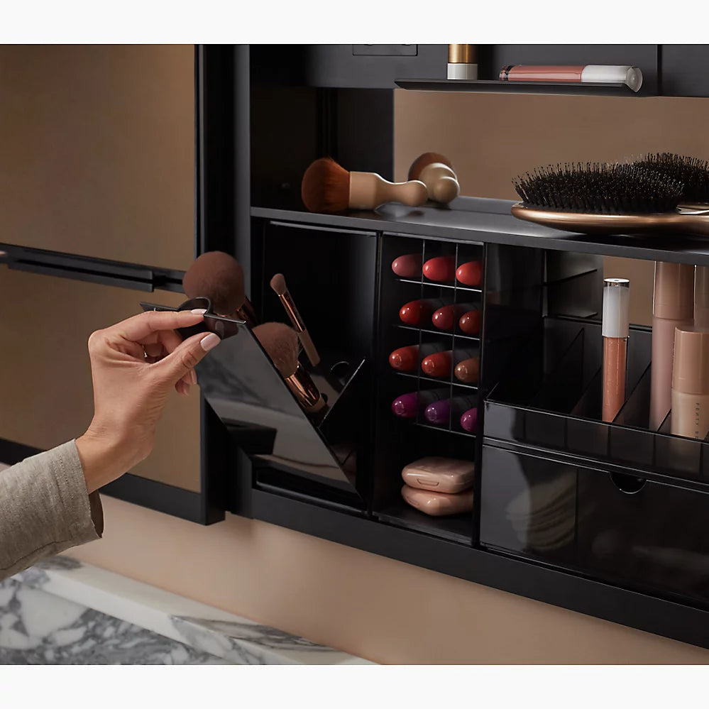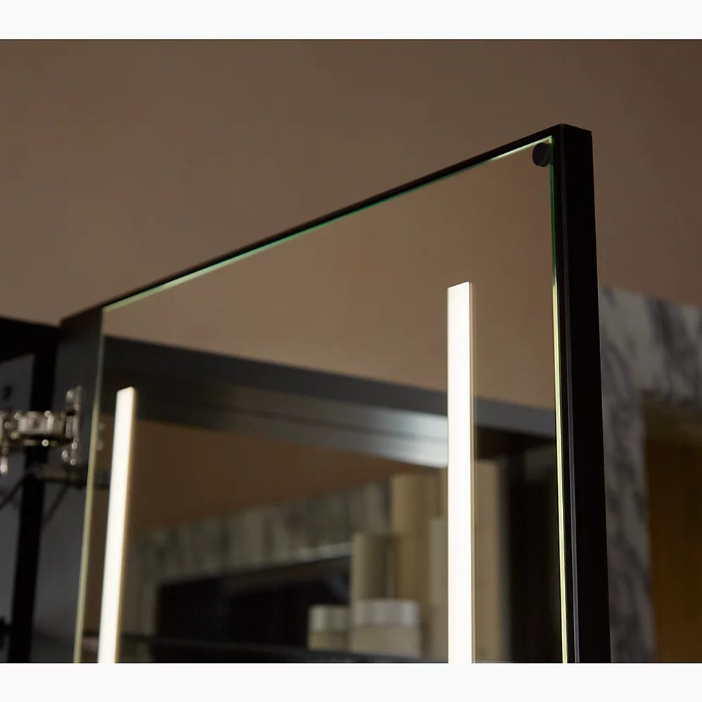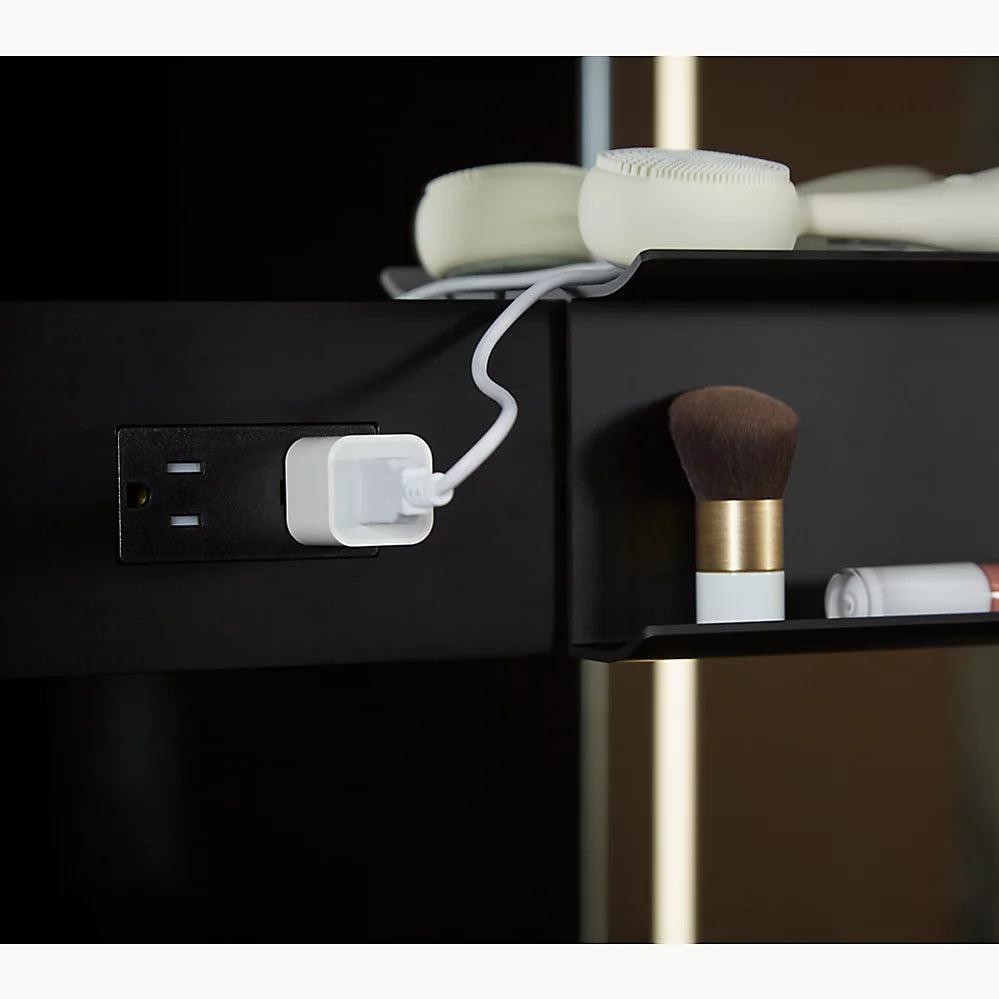 Mirror with LED lighting elevates your bathroom experienceApprox. 3000 – 6500 Kelvin (exterior frame) and 4000 Kelvin (inside door) light appearances deliver a neutral light ideal for overall bathroom aesthetics as well as tasksMinimum 90 CRI (color rendering index) lets you see yourself in the truest light for makeup application, grooming, and skin careTouch-control bar integrated within frame designSensor-activated lighting turns on when it detects user presence and off when it detects no motionBuilt-in dimmerThree-way adjustable slow-close hinges with 125° opening capability for easy cabinet accessDefogging feature ensures reflection visibility — even in high humidityCustom compartments for holding makeup brushes and other makeup itemsElectrical outlet allows users to plug in hair stylers and other grooming toolsOne adjustable tempered-glass shelfOne partially sliding utility bar shelf