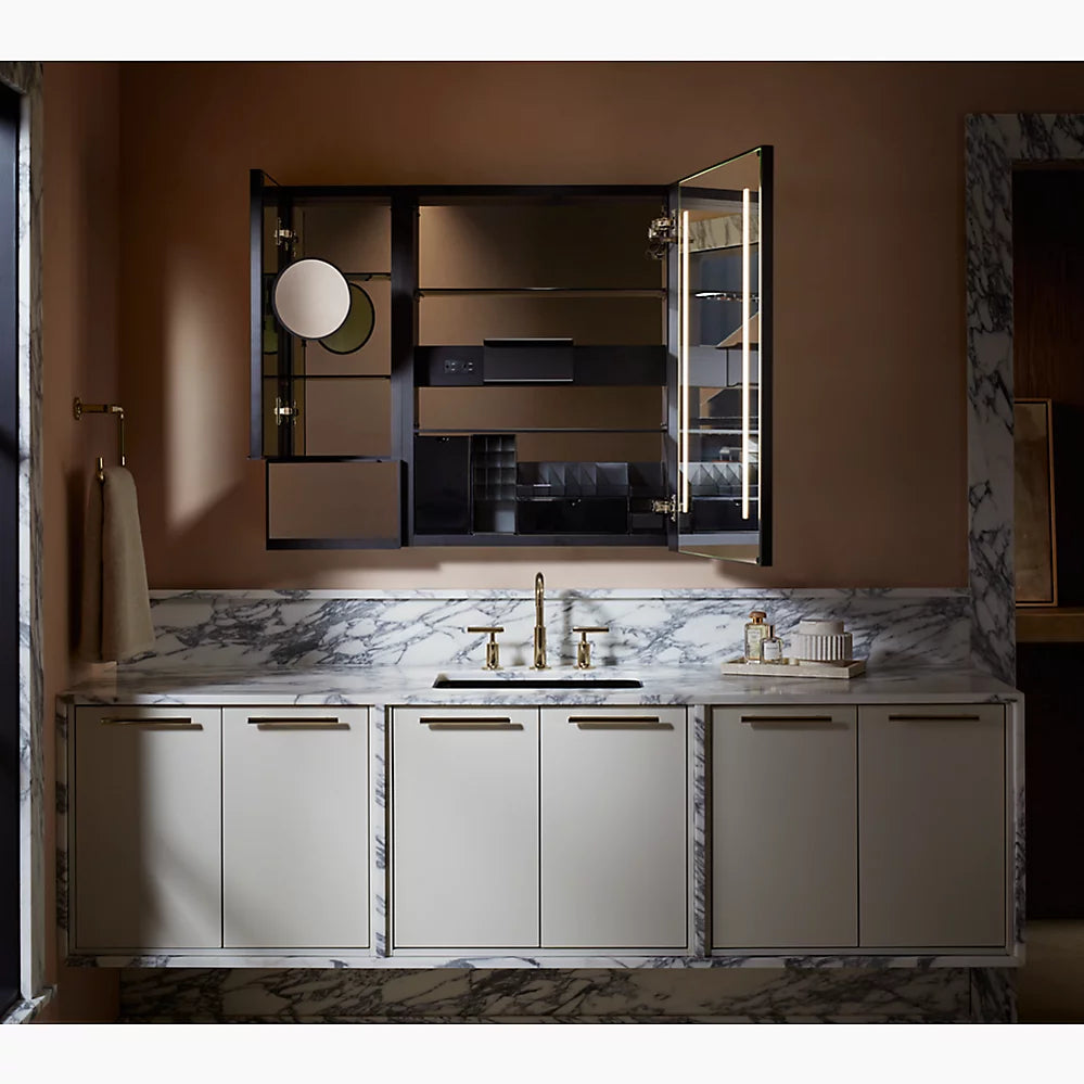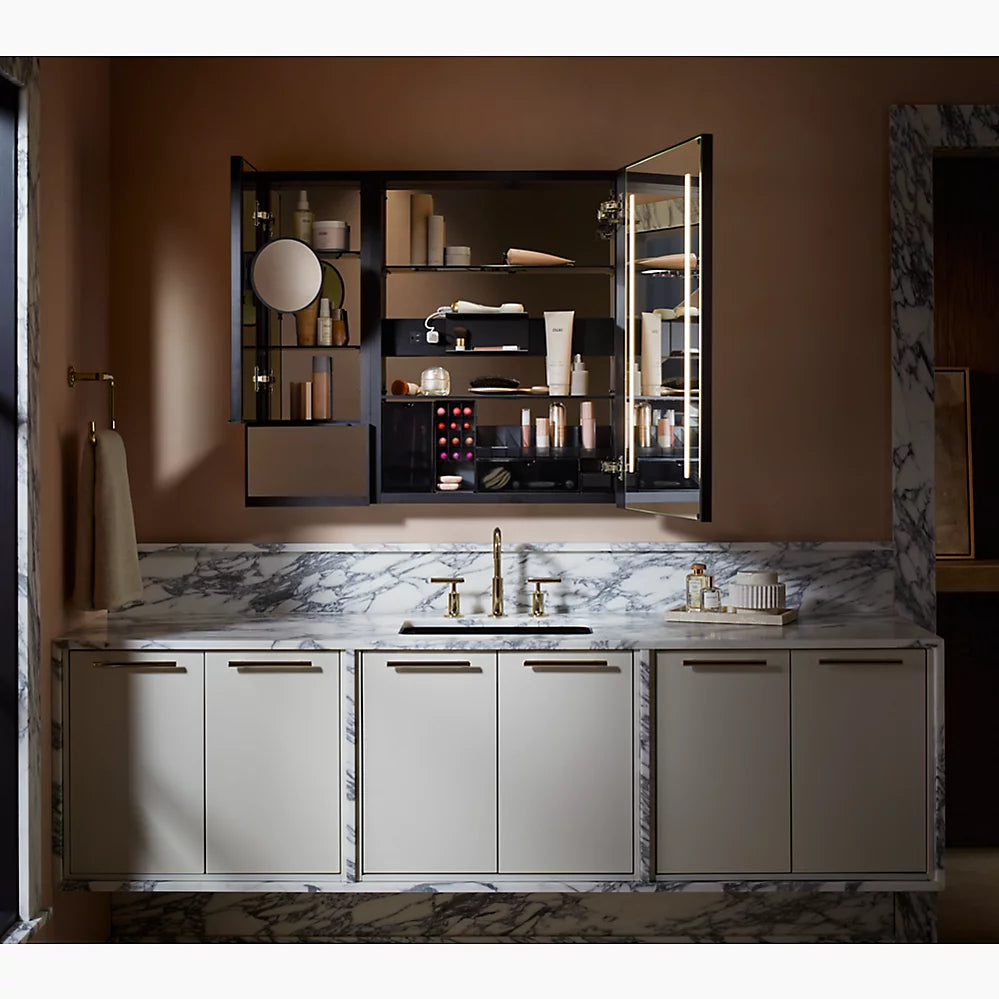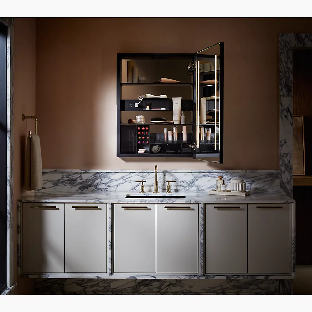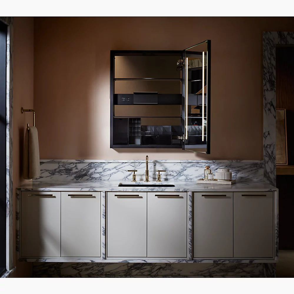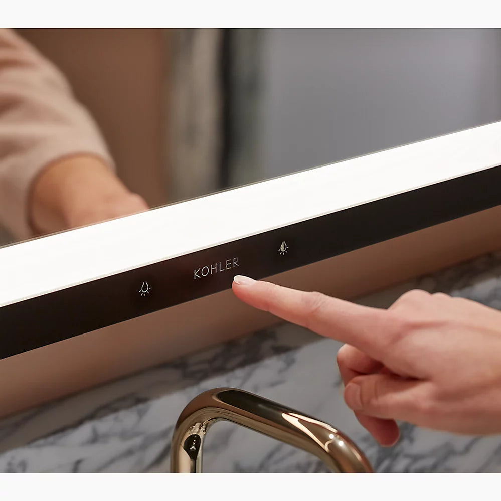 Mirror with LED lighting elevates your bathroom experienceApprox. 3000 – 6500 Kelvin (exterior frame) and 4000 Kelvin (inside door) light appearances deliver a neutral light ideal for overall bathroom aesthetics as well as tasksMinimum 90 CRI (color rendering index) lets you see yourself in the truest light for makeup application, grooming, and skin careTouch-control bar integrated within frame designSensor-activated lighting turns on when it detects user presence and off when it detects no motionBuilt-in dimmerThree-way adjustable slow-close hinges with 125° opening capability for easy cabinet accessDefogging feature ensures reflection visibility — even in high humidityCustom compartments for holding makeup brushes and other makeup itemsElectrical outlet allows users to plug in hair stylers and other grooming toolsOne adjustable tempered-glass shelfOne partially sliding utility bar shelf