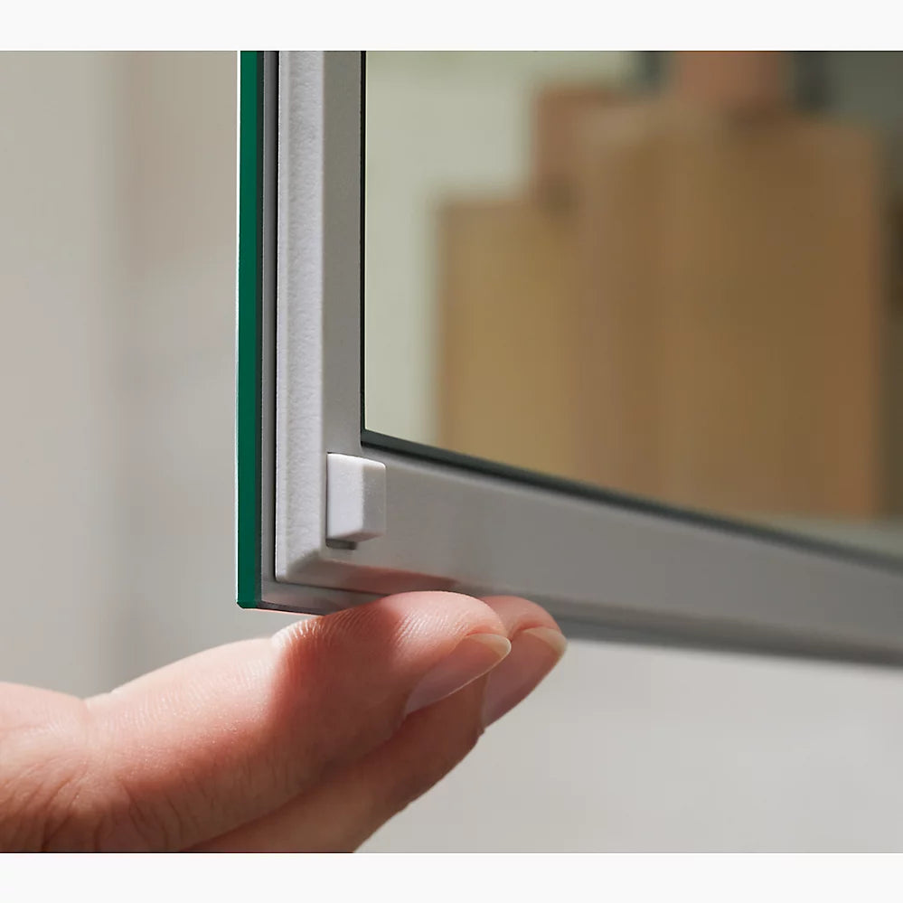 4" (102 mm) -deep shelves offer more room for larger jars, bottles, and grooming suppliesThree adjustable tempered-glass shelves offer additional bathroom storageFull-overlay mirrored door with flat edgesMirrored interiorThree-way adjustable slow-close hinges with 105° opening capability for easy cabinet accessEasy-hang bracket mounts cabinet securely and simplifies surface-mount applicationsIncludes side mirror kit for surface-mount installation
