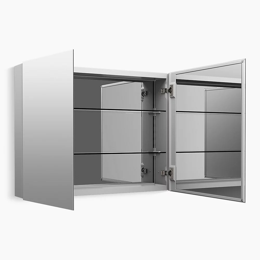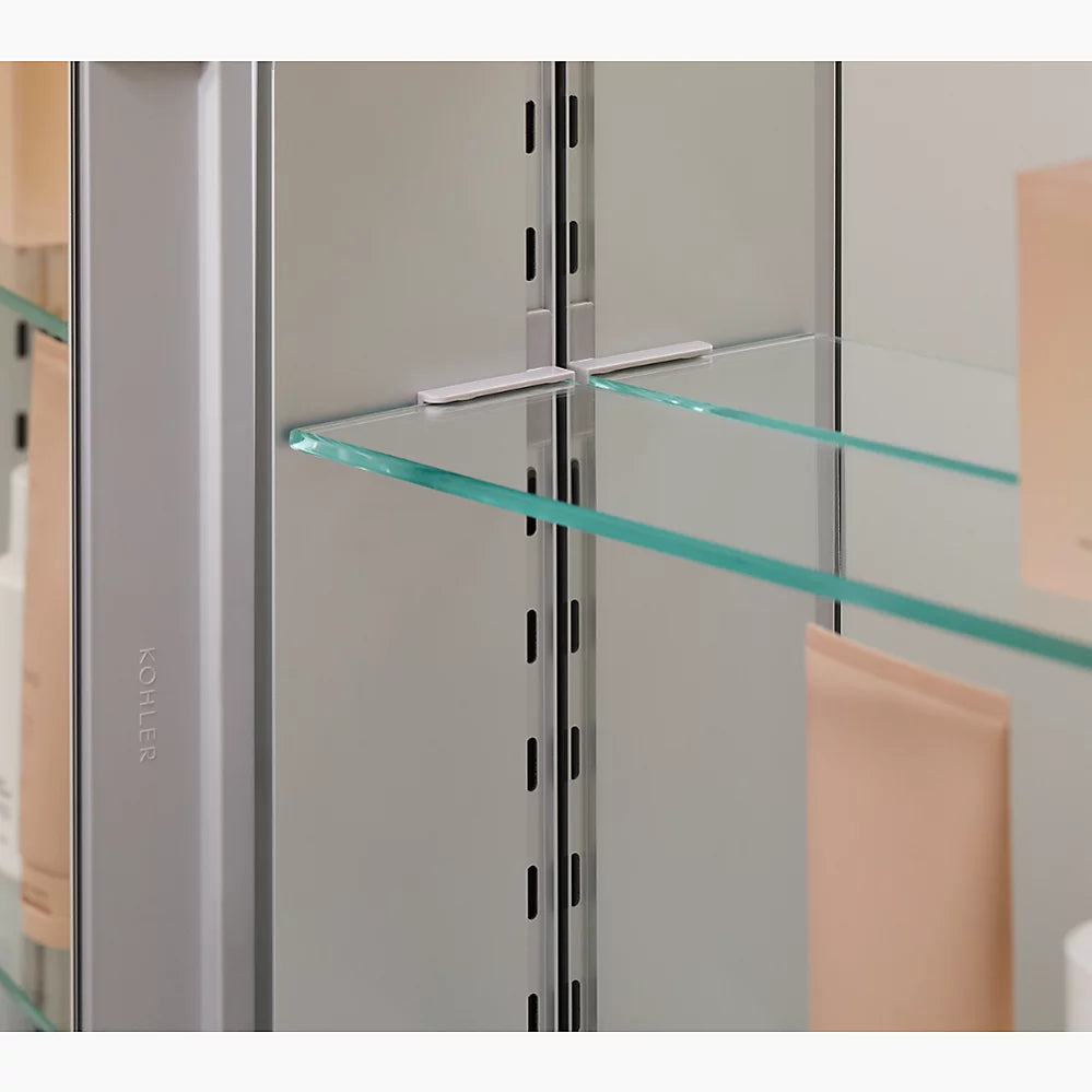 4" (102 mm) -deep shelves offer more room for larger jars, bottles, and grooming suppliesTwo adjustable tempered-glass shelves offer additional bathroom storageTwo full-overlay mirrored doors with flat edgesMirrored interiorThree-way adjustable slow-close hinges with 105° opening capability for easy cabinet accessEasy-hang bracket mounts cabinet securely and simplifies surface-mount applicationsIncludes side mirror kit for surface-mount installation