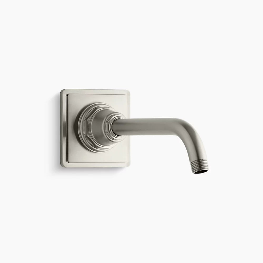 Evoking the classic elegance and Art Deco sensibility of the 1930s, this Pinstripe showerarm and flange create a crisp, refined look in your bathroom and shower. The showerarm provides a solid mount for a variety of showerheads and includes a square flange for a decorative accent. Its brass construction ensures long-lasting durability.