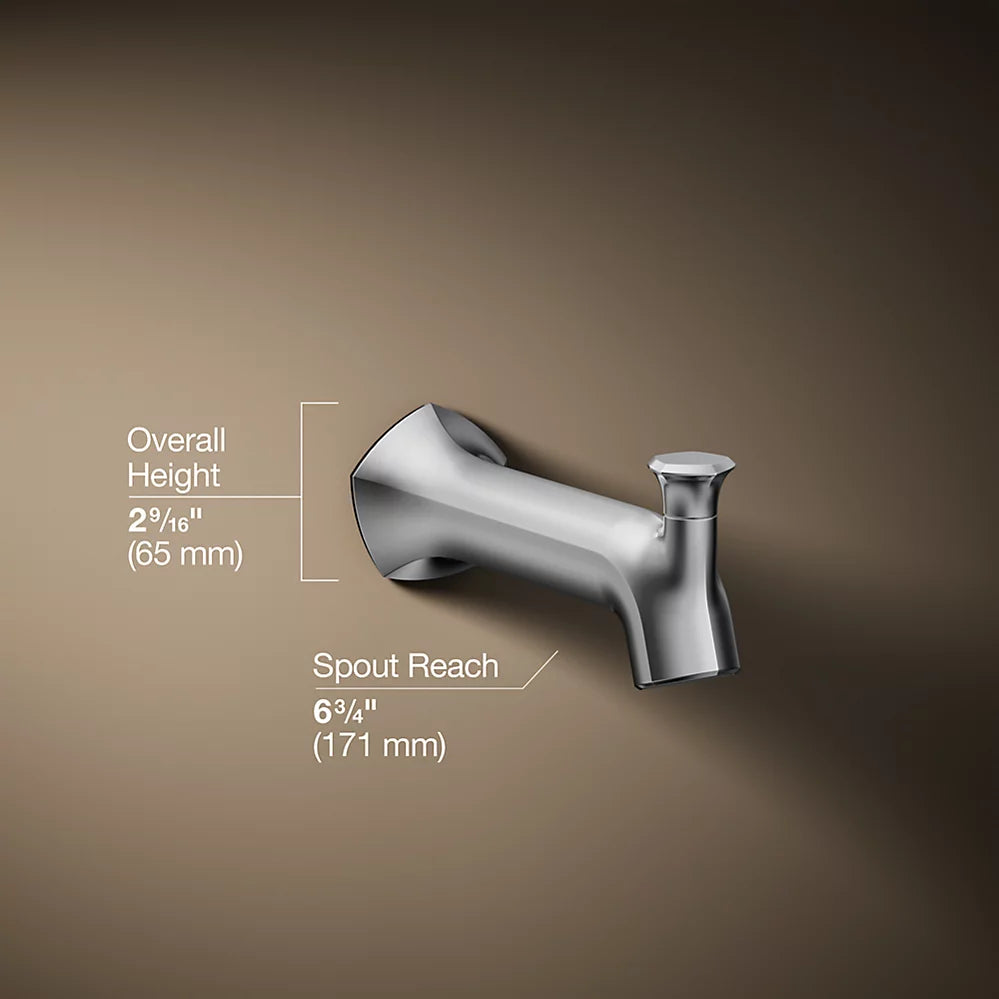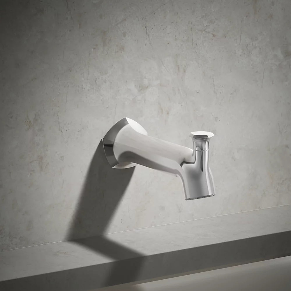 Unapologetically luxurious and truly unforgettable, Occasion bathroom faucets and accessories draw inspiration from 1960s Hollywood glamour and extravagance. Fashioned after the era’s sleek dress lines and bold car designs, the Occasion collection reflects graceful elegance, blending classic midcentury and modern design. Customize your bath with the collection’s distinctive pentagonal accents, faceted bases, flowing lines, and delicate edges. Choose a spout, handles, and finish to build your own signature design. Minimalist with soft square angles, the Occasion wall-mount diverter bath spout with Straight design pairs with your choice of Occasion wall-mount bath faucet handles for a look as fashionable as it is functional.