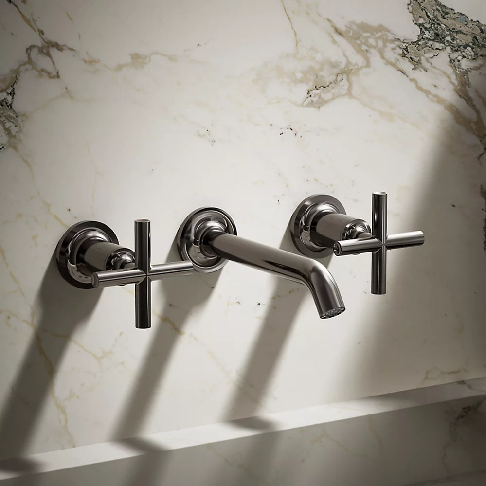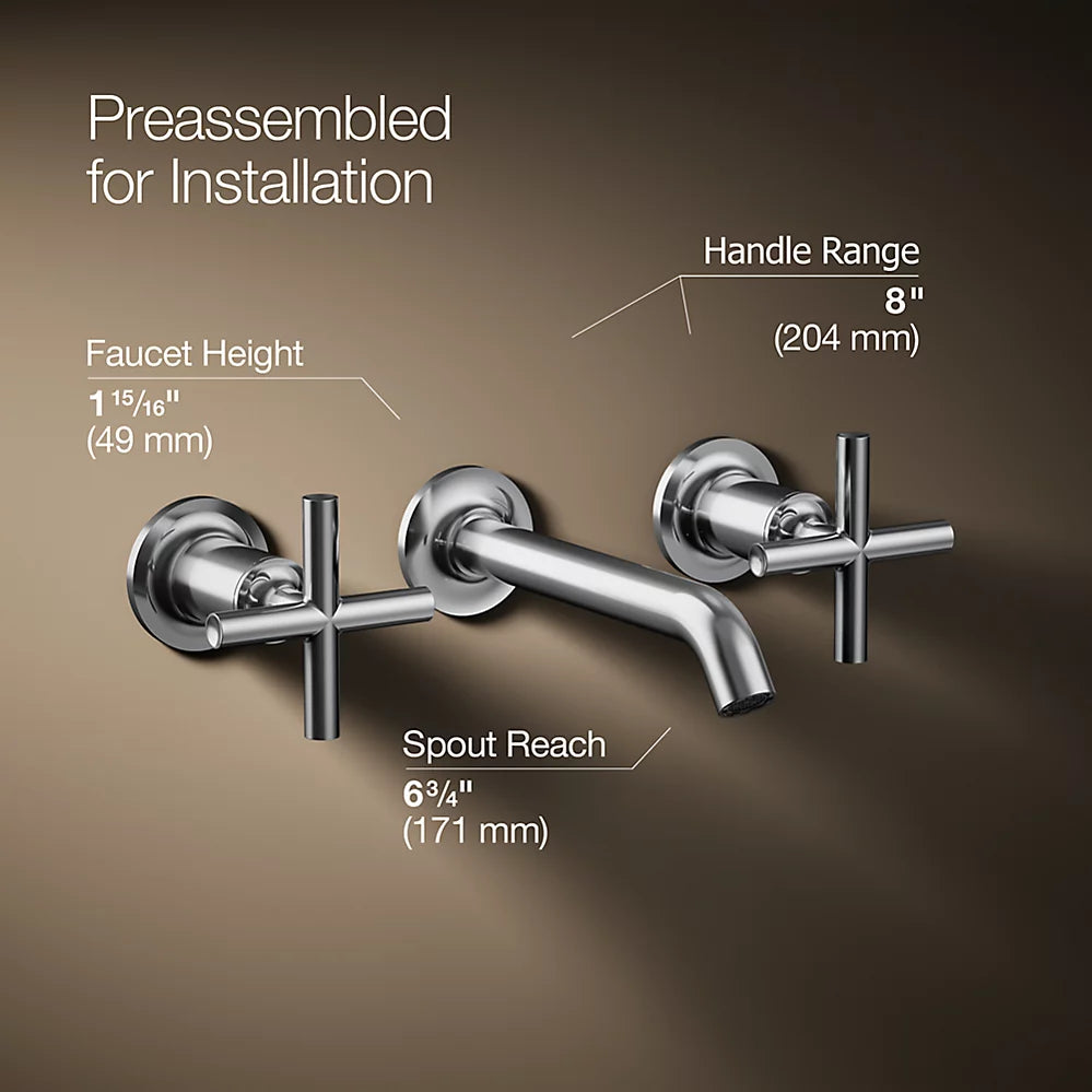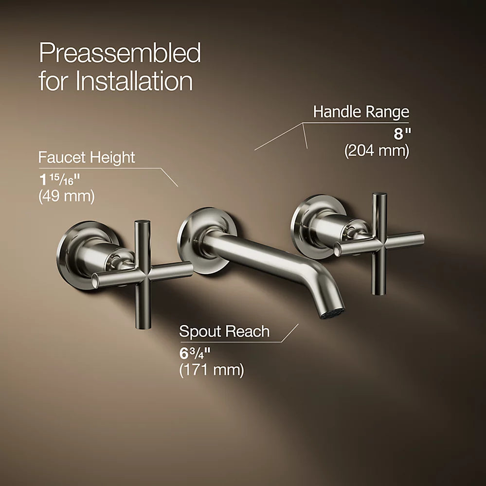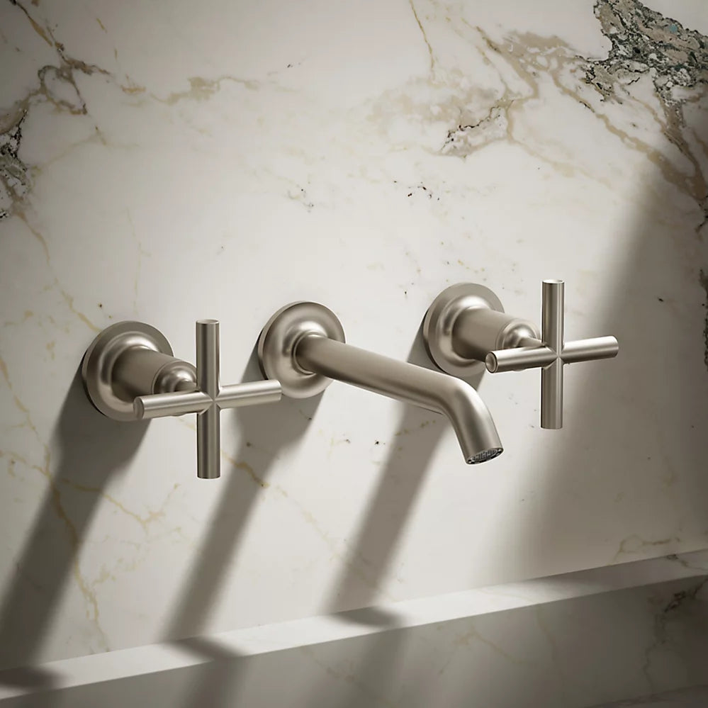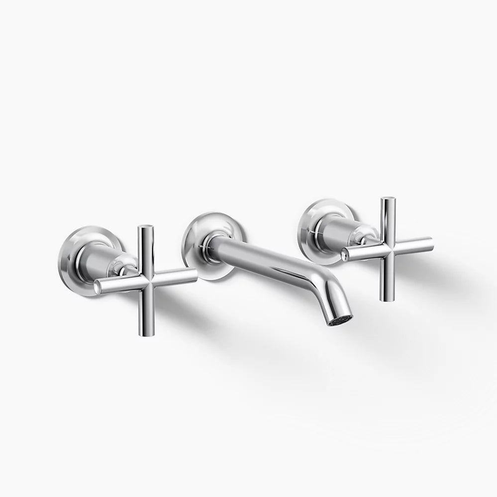 Capturing the style of minimalist design, Purist faucets deliver streamlined water control. This sink faucet trim features a 35-degree angled spout and cross handles for easy operation. The convenient wall-mount design provides a clutter-free countertop in your bath or powder room. When paired with a two-handle ceramic disc valve, this trim offers optimal performance. Combine it with bath accessories from the Purist collection for a distinctively modern and unified decor.
