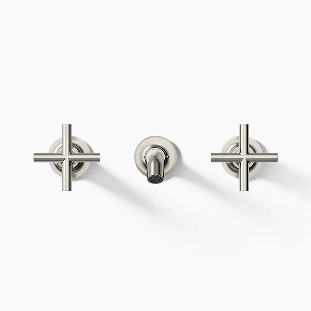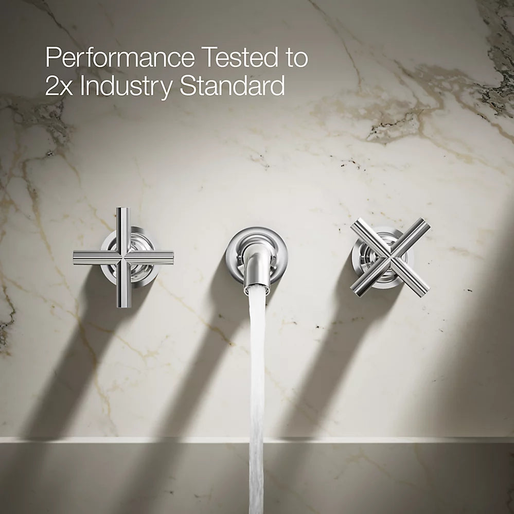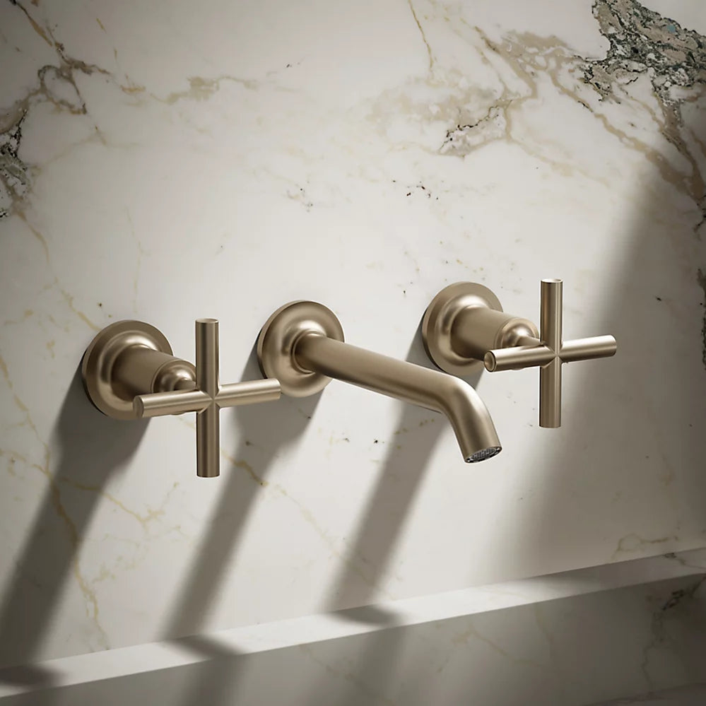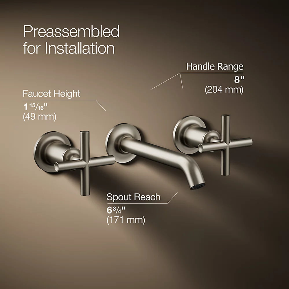 Capturing the style of minimalist design, Purist faucets deliver streamlined water control. This sink faucet trim features a 35-degree angled spout and cross handles for easy operation. The convenient wall-mount design provides a clutter-free countertop in your bath or powder room. When paired with a two-handle ceramic disc valve, this trim offers optimal performance. Combine it with bath accessories from the Purist collection for a distinctively modern and unified decor.