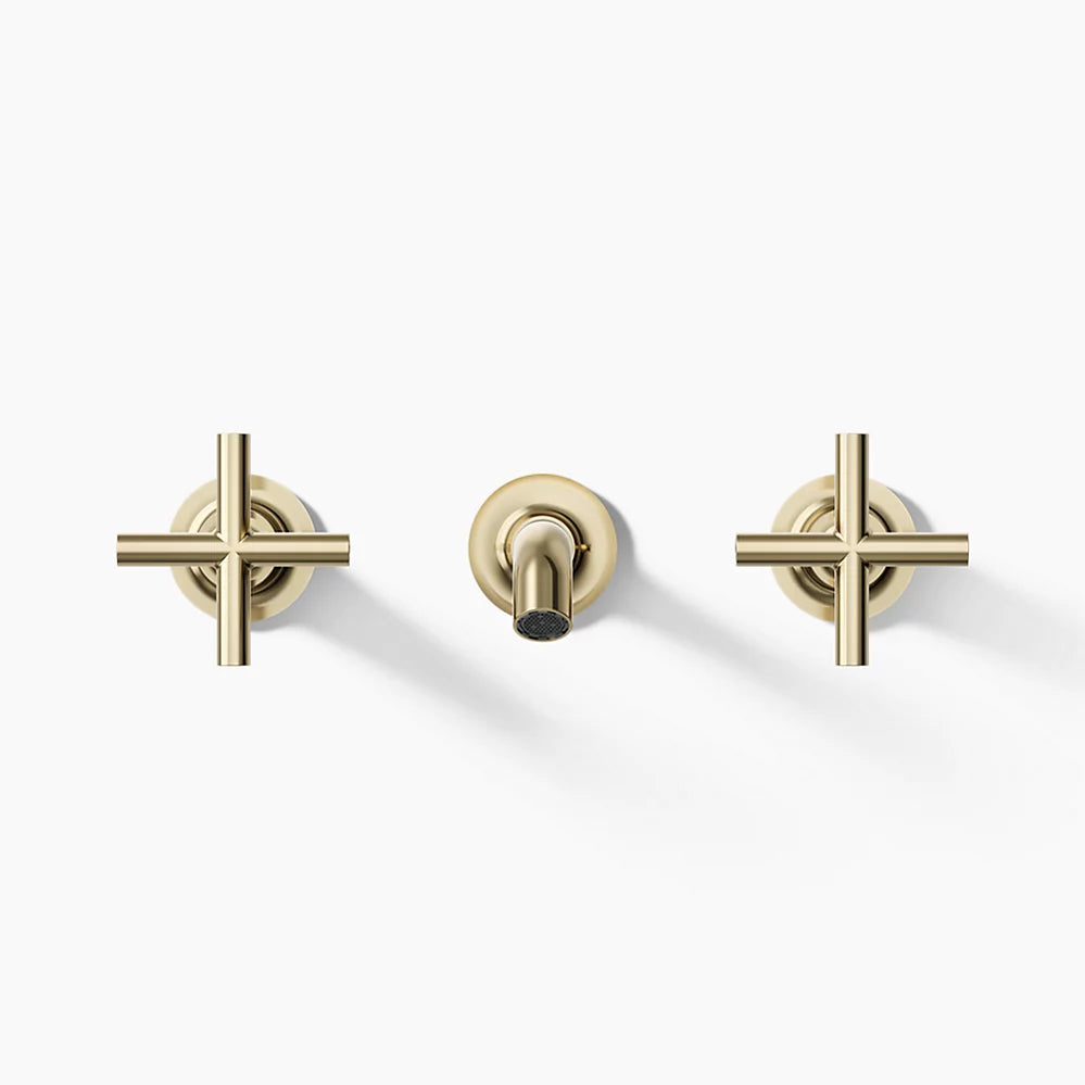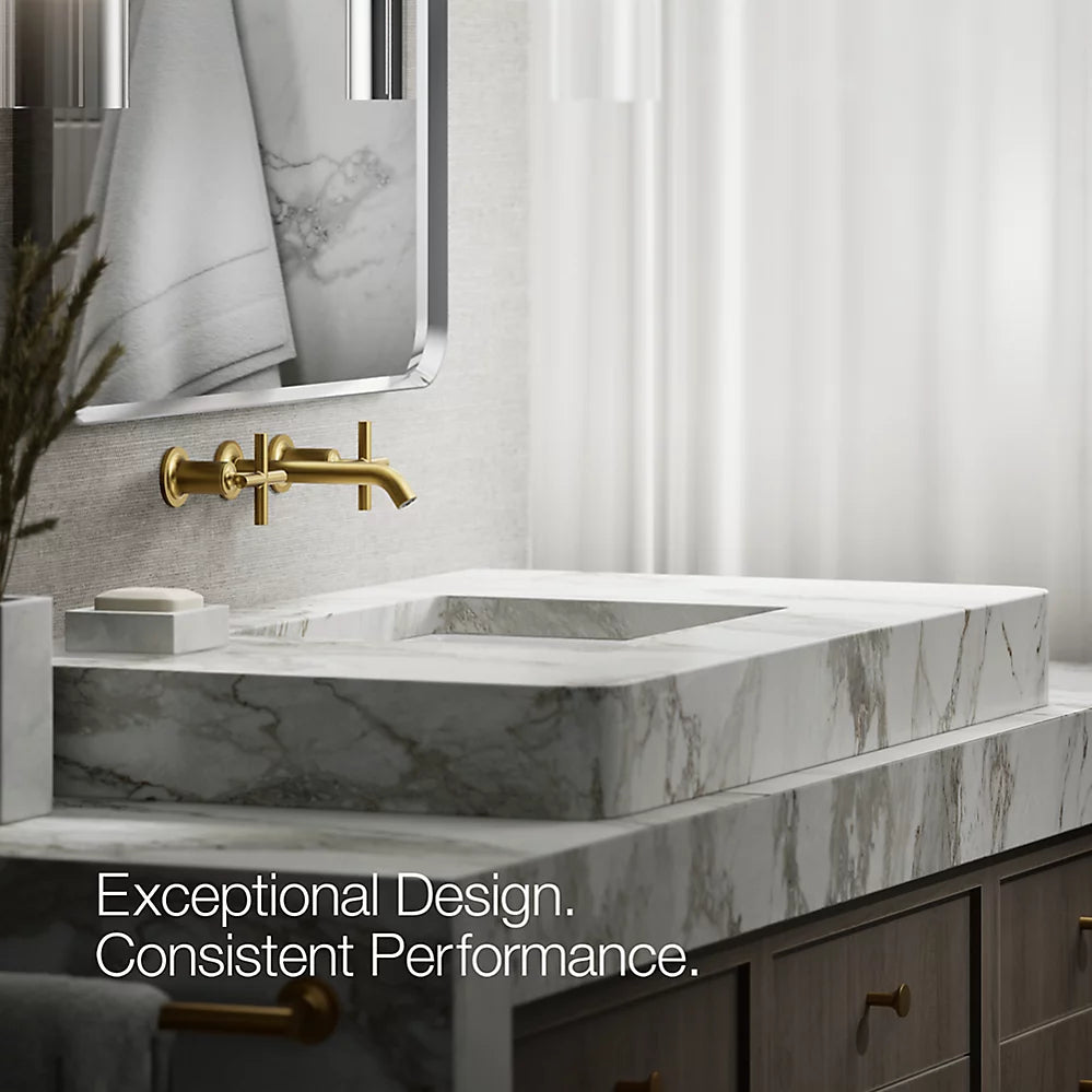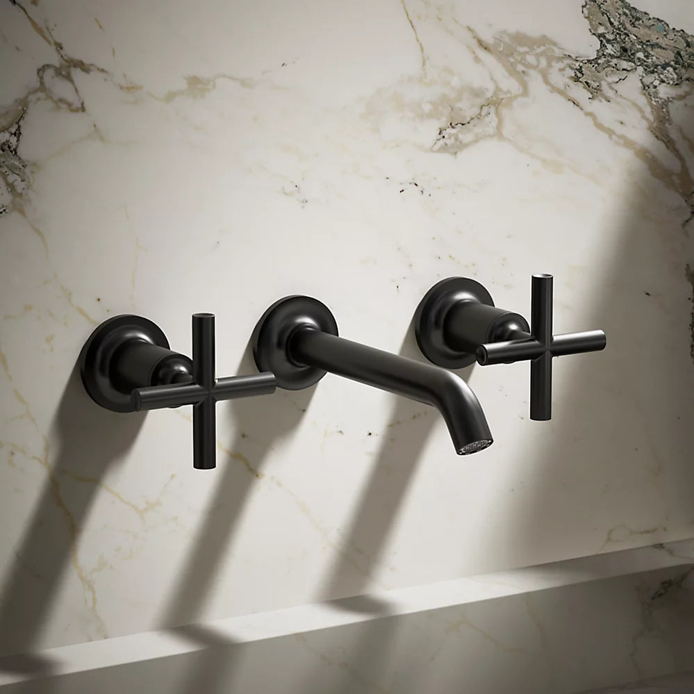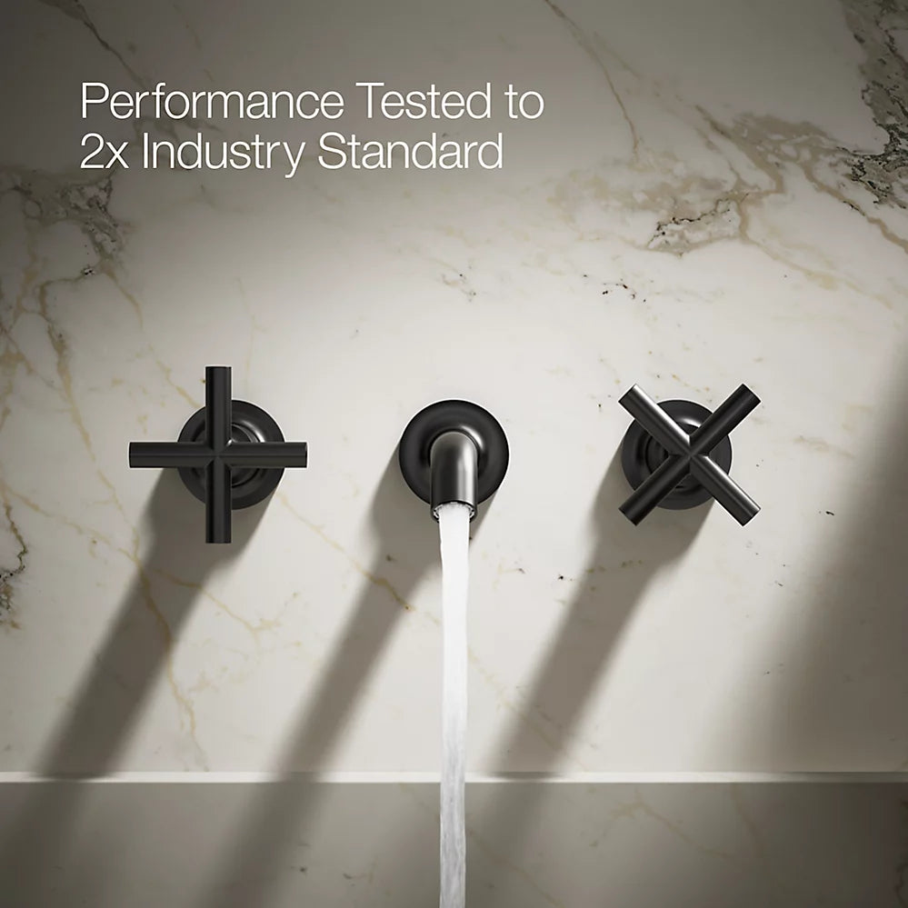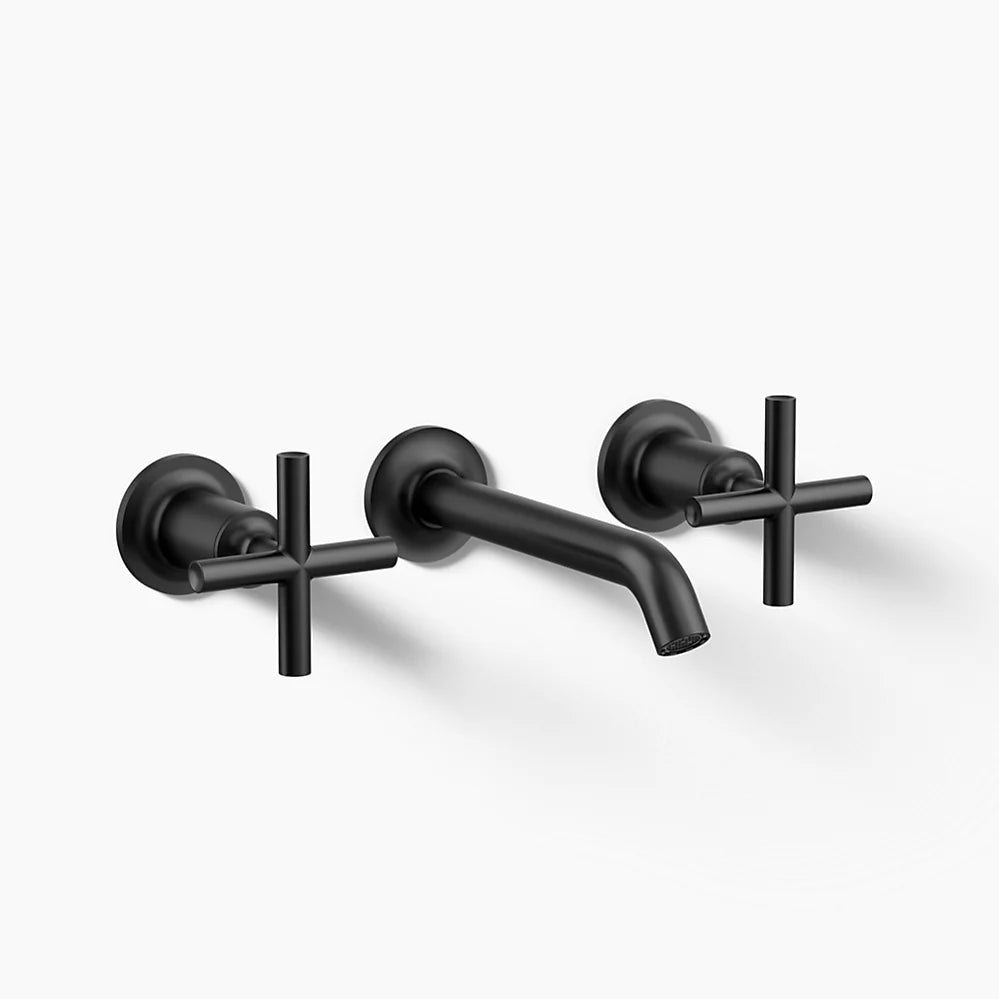 Capturing the style of minimalist design, Purist faucets deliver streamlined water control. This sink faucet trim features a 35-degree angled spout and cross handles for easy operation. The convenient wall-mount design provides a clutter-free countertop in your bath or powder room. When paired with a two-handle ceramic disc valve, this trim offers optimal performance. Combine it with bath accessories from the Purist collection for a distinctively modern and unified decor.