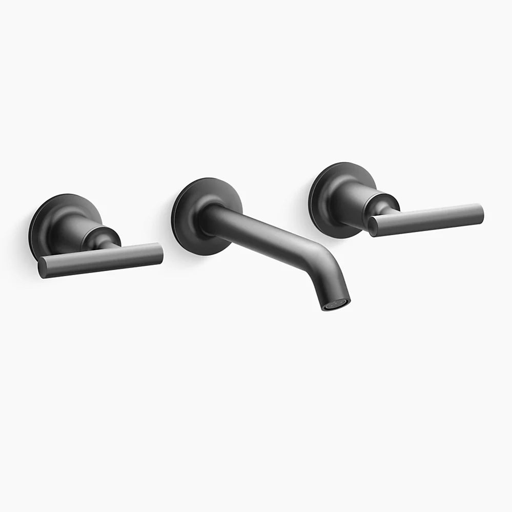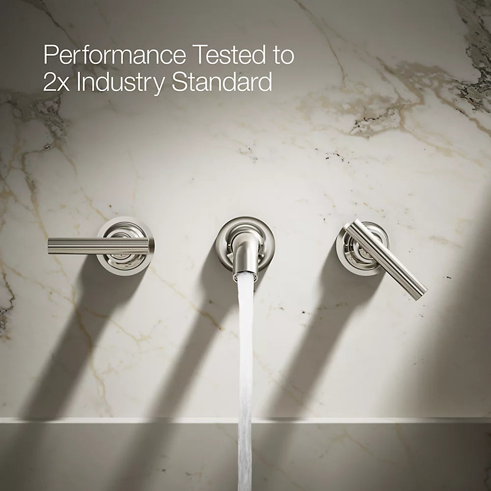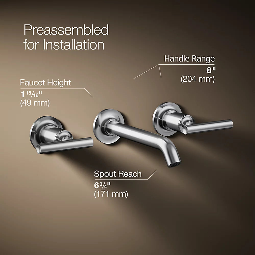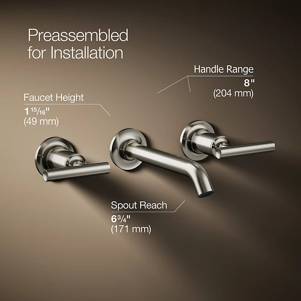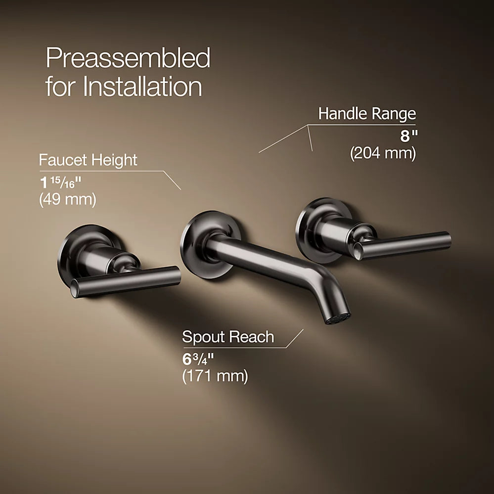 Capturing the style of minimalist design, Purist faucets deliver streamlined water control. This sink faucet trim features a 35-degree angled spout and lever handles for easy operation. The convenient wall-mount design provides a clutter-free countertop in your bath or powder room. When paired with a two-handle ceramic disc valve, this trim offers optimal performance.
