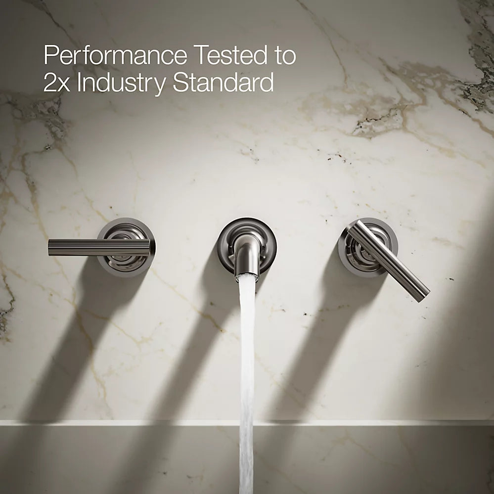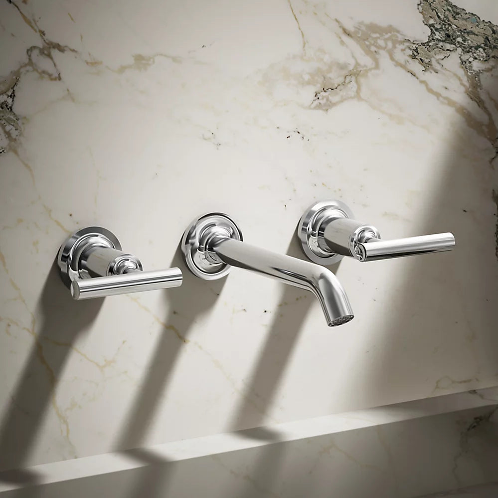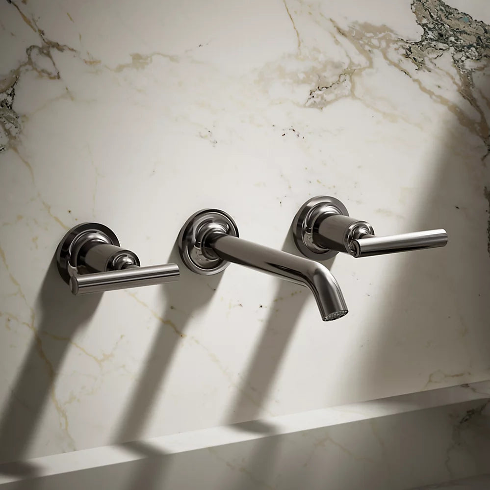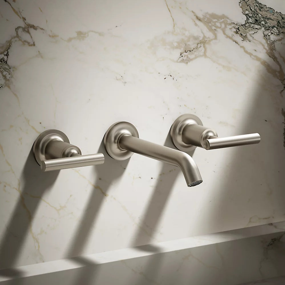 Capturing the style of minimalist design, Purist faucets deliver streamlined water control. This sink faucet trim features a 35-degree angled spout and lever handles for easy operation. The convenient wall-mount design provides a clutter-free countertop in your bath or powder room. When paired with a two-handle ceramic disc valve, this trim offers optimal performance.
