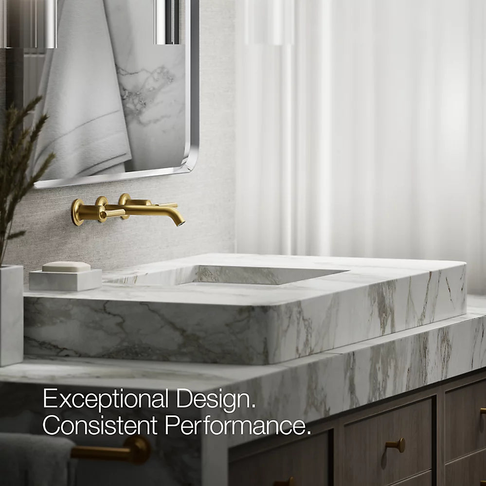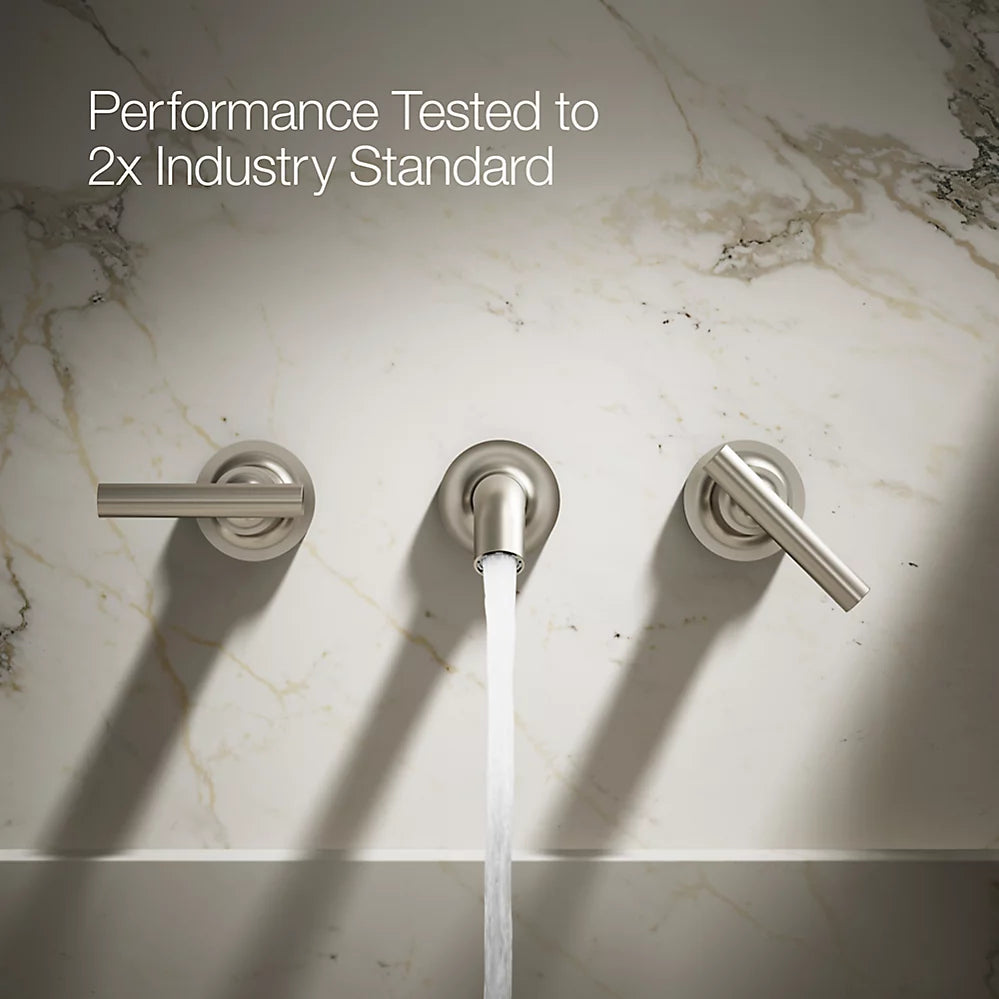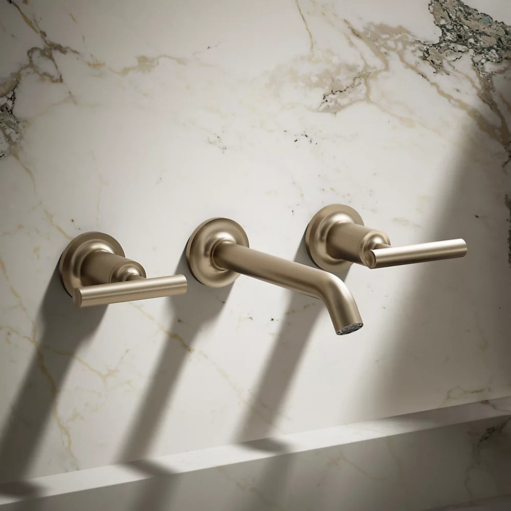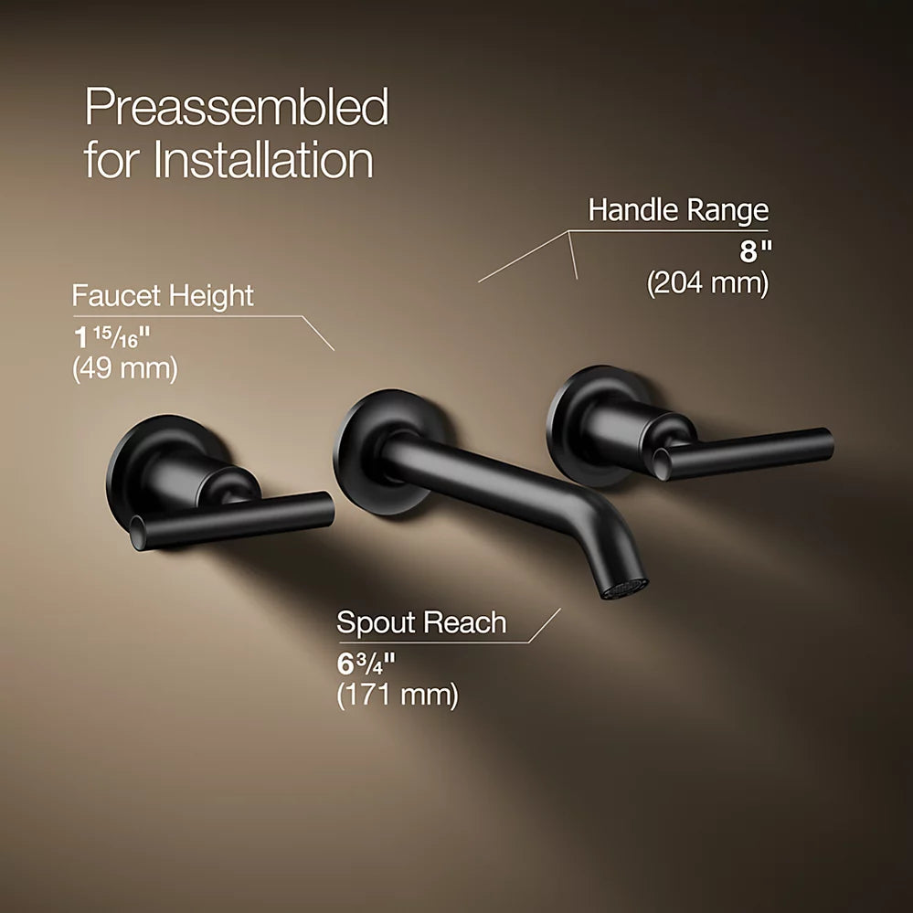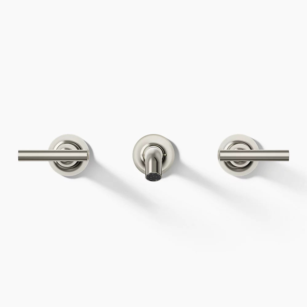 Capturing the style of minimalist design, Purist faucets deliver streamlined water control. This sink faucet trim features a 35-degree angled spout and lever handles for easy operation. The convenient wall-mount design provides a clutter-free countertop in your bath or powder room. When paired with a two-handle ceramic disc valve, this trim offers optimal performance.