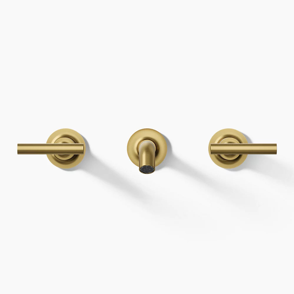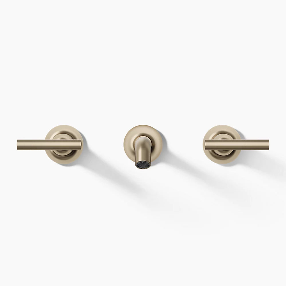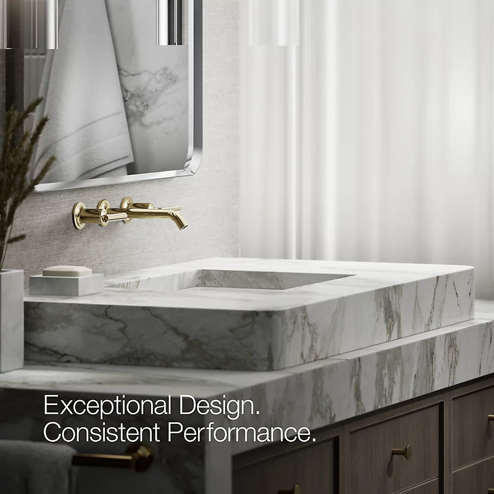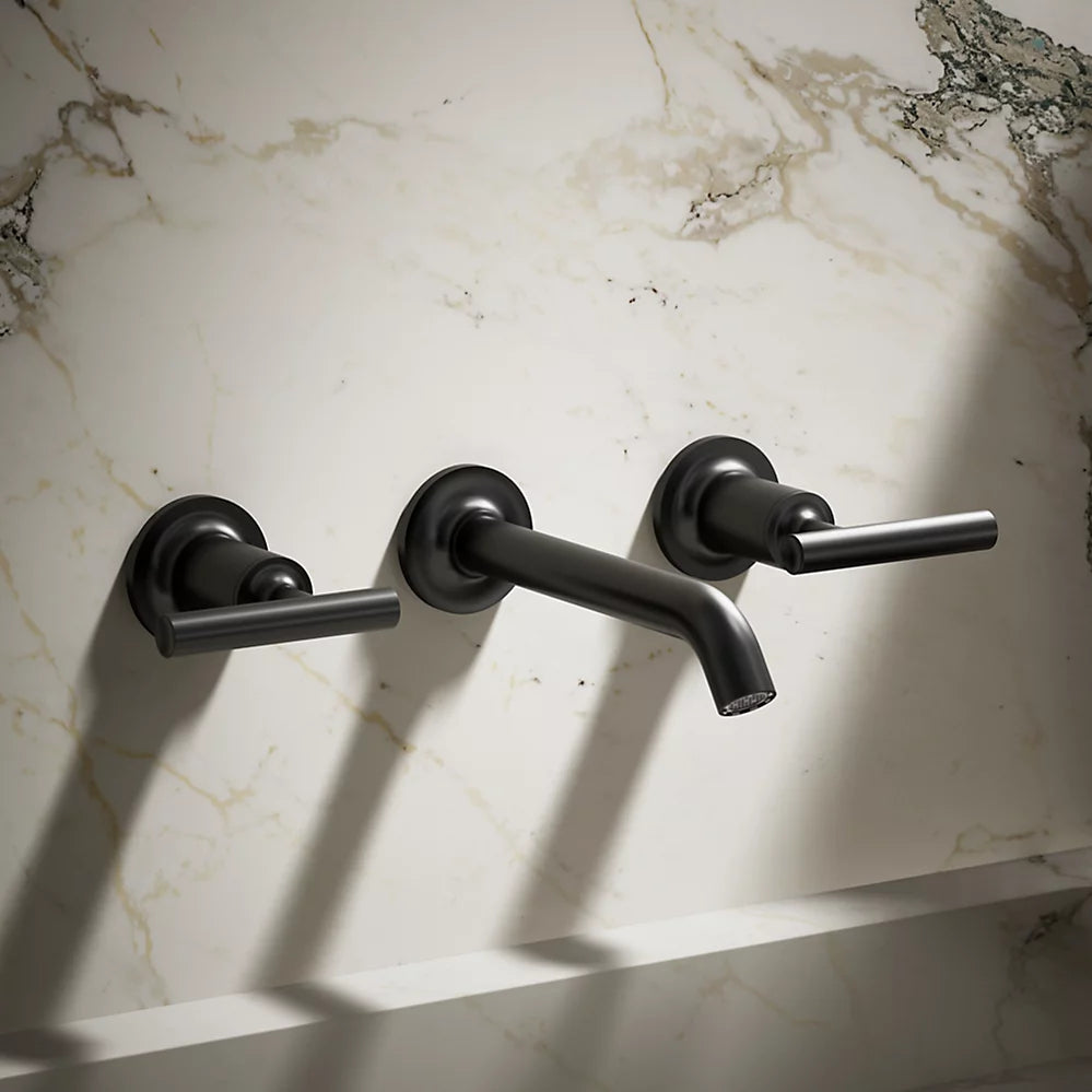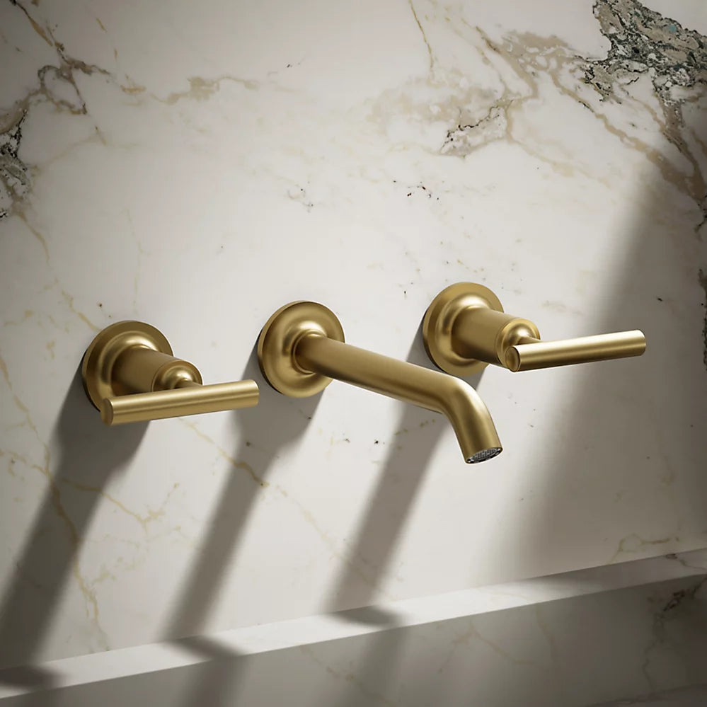 Capturing the style of minimalist design, Purist faucets deliver streamlined water control. This sink faucet trim features a 35-degree angled spout and lever handles for easy operation. The convenient wall-mount design provides a clutter-free countertop in your bath or powder room. When paired with a two-handle ceramic disc valve, this trim offers optimal performance.