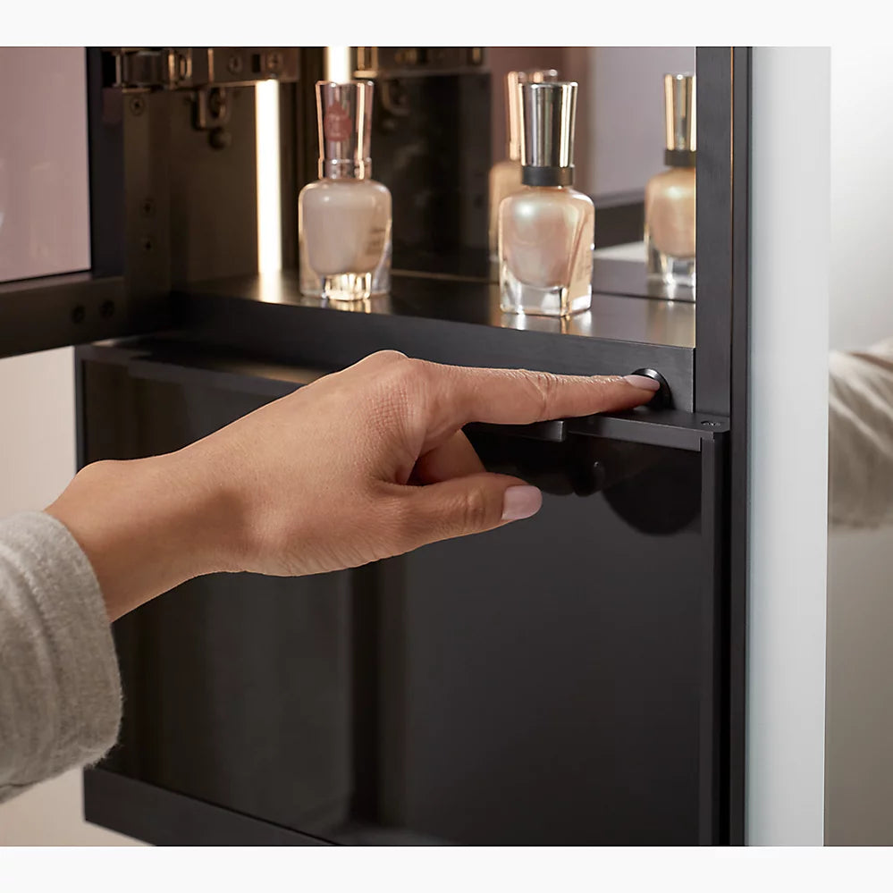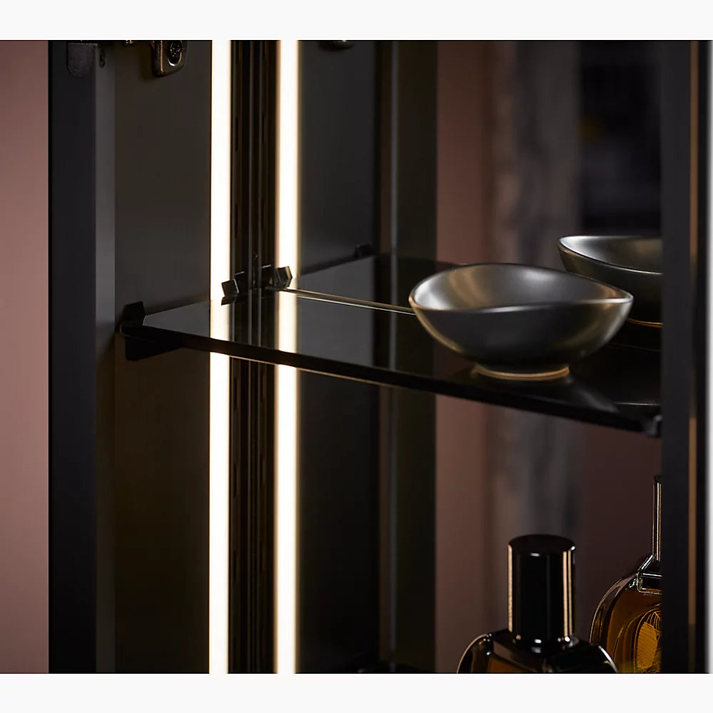 - Framed tinted glass showcase door and interior cabinet lighting artfully displays your perfume and skincare products