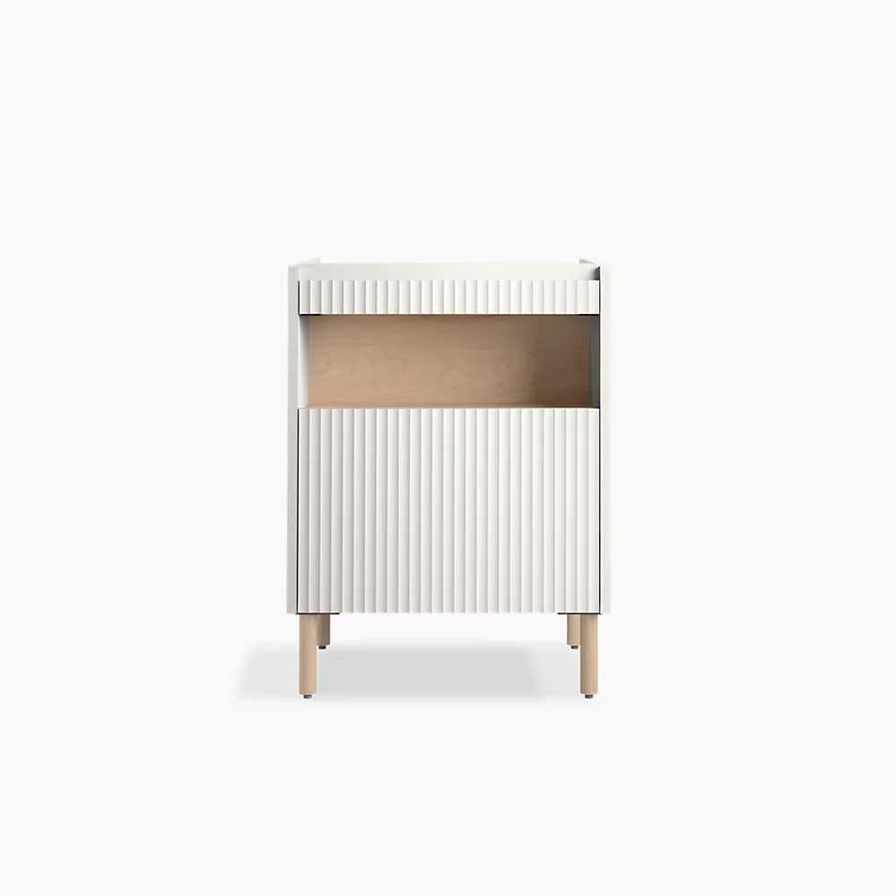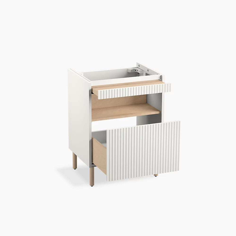Bathroom vanity cabinetContemporary cabinetry features unique fluted panelingSlide-out deck provides additional countertop space to set your phone or other small itemsOpen shelf for easy access to bathroom accessoriesDeep bottom drawer provides ample storage for larger bathroom itemsIncluded optional vanity legs give cabinet an elevated lookCoordinates with the K-31554 Spacity™ 24" vanity top with integrated sink for overhanging cabinet coverage (sold separately)