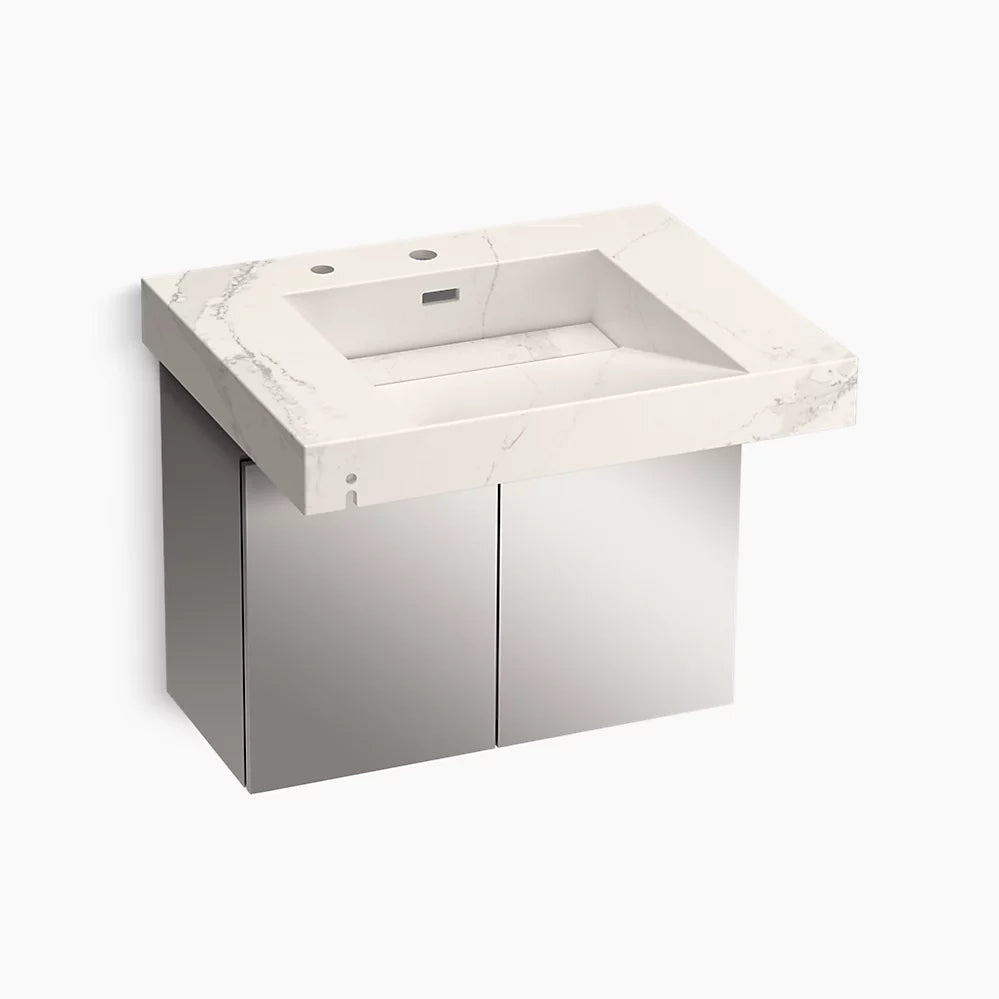 Lavatory system offers contemporary styling for commercial applicationsBasin and trough slope design prevents water from splashing back on userPredrilled mounting holes for faucet and soap dispenserDrain strainer helps prevent debris from entering drainLavatory system available in your choice of Silestone® quartz or Corian® Solid Surface in a host of color optionsSilestone® quartz provides exceptional durability and stain resistance, making it easy to maintainCorian® Solid Surface has a nonporous surface to help prevent bacteria and mold growthVandal-resistant locking door on stainless steel shroud conceals pipes and swings open to provide easy below-deck access for maintenanceRequires select Composed®, Kumin®, or Oblo® deck-mount faucet and soap dispenser bundles (sold separately)