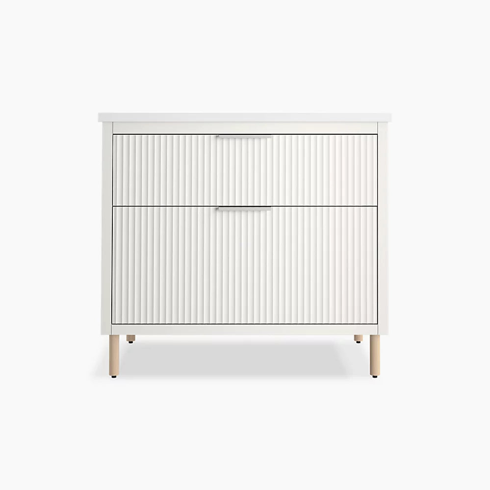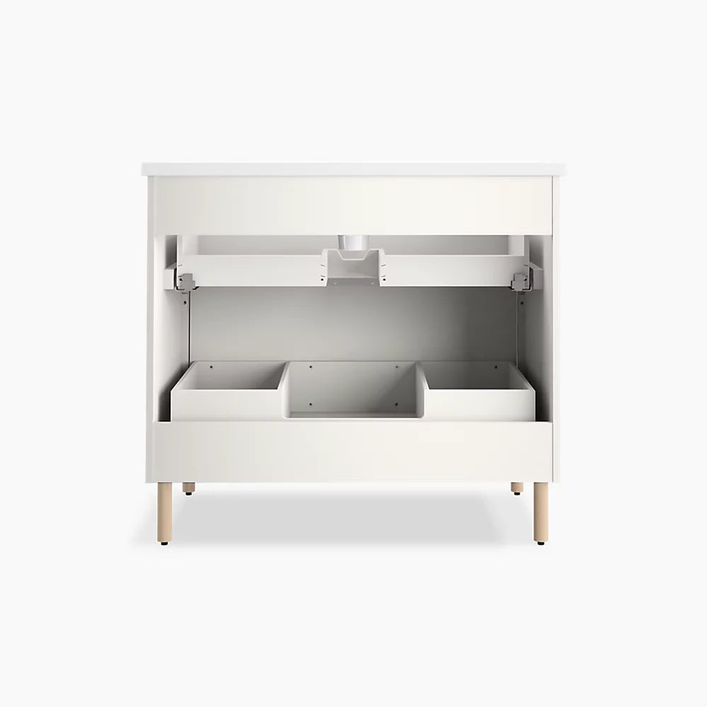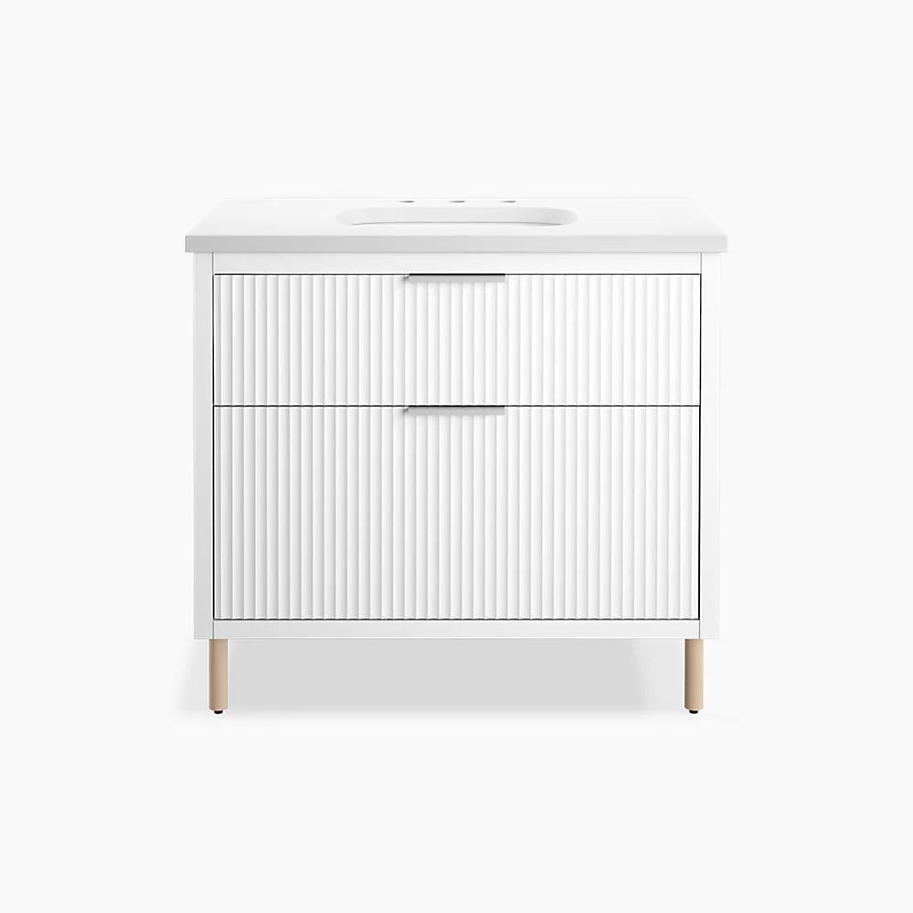 The Spacity 36" wall-hung bathroom vanity set, comprised of a cabinet, sink, and top, is designed to maximize small-space living. Including a beautiful and durable quartz top and an undermount sink, this vanity coordinates with your choice of deck-mount widespread faucet for true customization. The cabinet's functional drawers feature fluted exterior paneling and integrated pull handles, along with plenty of space to stow grooming accessories and other bathroom items. Pair with complementary KOHLER® drawer organizers to meet all your storage needs (sold separately).