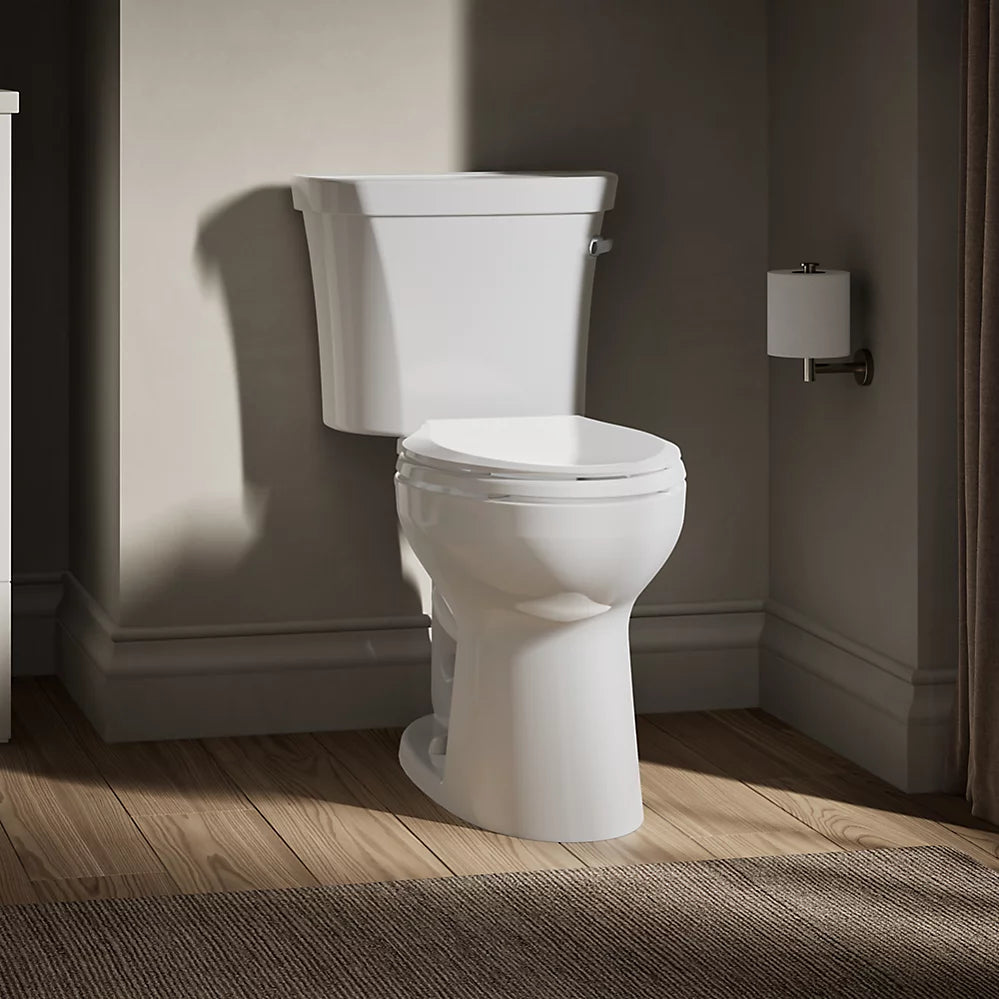 Enhance your bathroom space with this redesigned KOHLER Highline two-piece elongated toilet with right-hand trip lever.