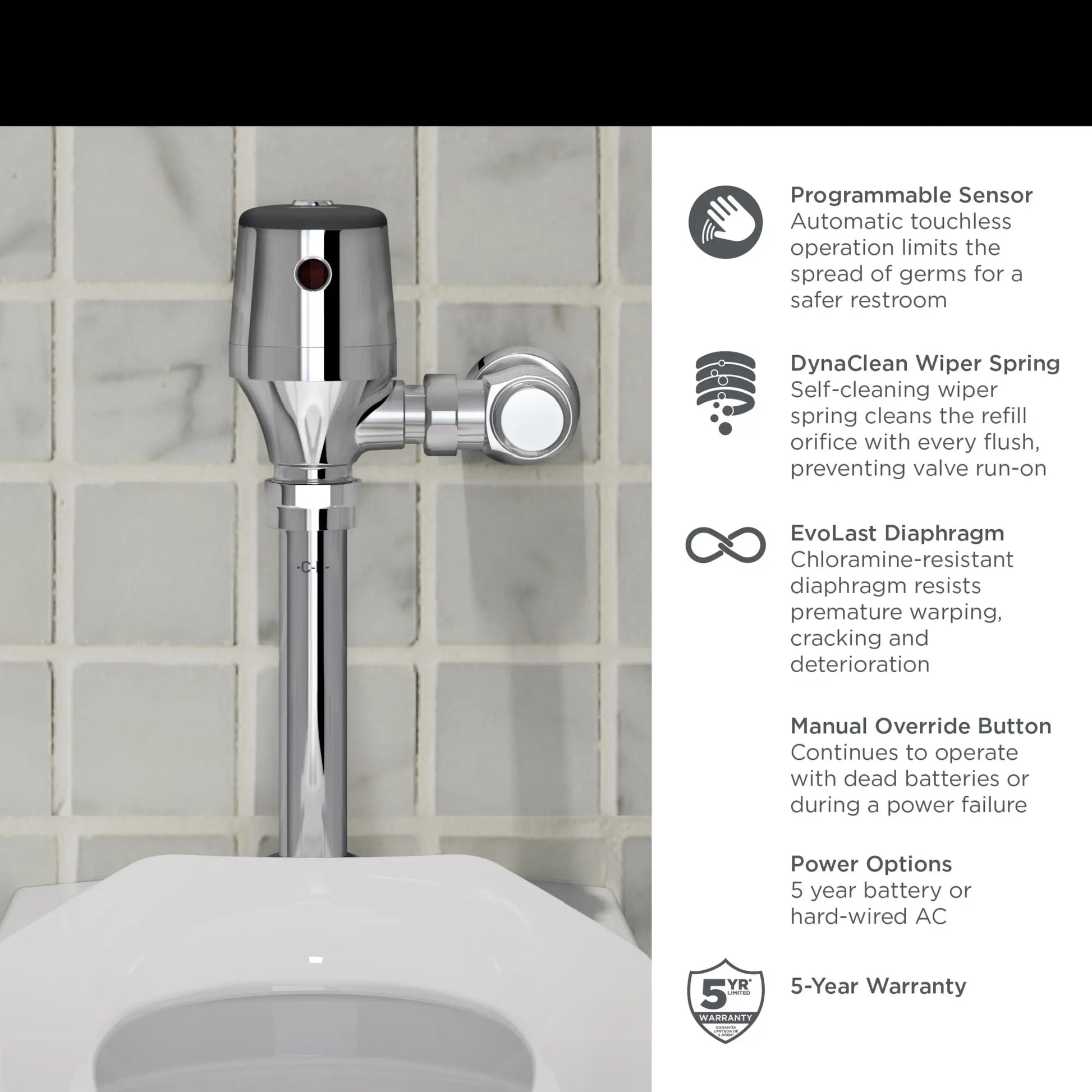 Ultima® Selectronic® Touchless Diaphragm Flush Valves from American Standard combine superior reliability and performance with a clean, streamlined design. Equipped with advanced technology including a programmable Selectronic infrared sensor for reliable hands-free operation, the clog-resistant DynaClean wiper spring to reduce valve run-on and save water, and the premium, chemical-resistant EvoLast diaphragm material for long life. Ultima Selectronic Diaphragm Flush Valves promise to exceed expectations and help control costs. The DynaClean and EvoLast features save money and reduces maintenance by greatly increasing the life of the diaphragm assembly. Designed to accommodate most applications, these ADA compliant flush valves will fit under a grab bar without modification for use in ADA and non-ADA stalls. Long-life battery lasts 5 years at 4,000 uses per month. Available in multiple high-efficiency flush volumes with battery or AC power options to meet the requirements of every project.